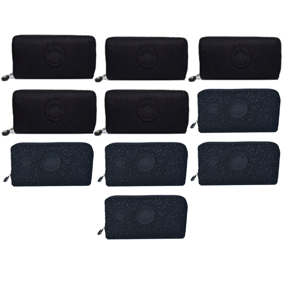 Contiene 10 billeteras de un mismo modelo, 5 negras lisas y 5 negras brillosa.