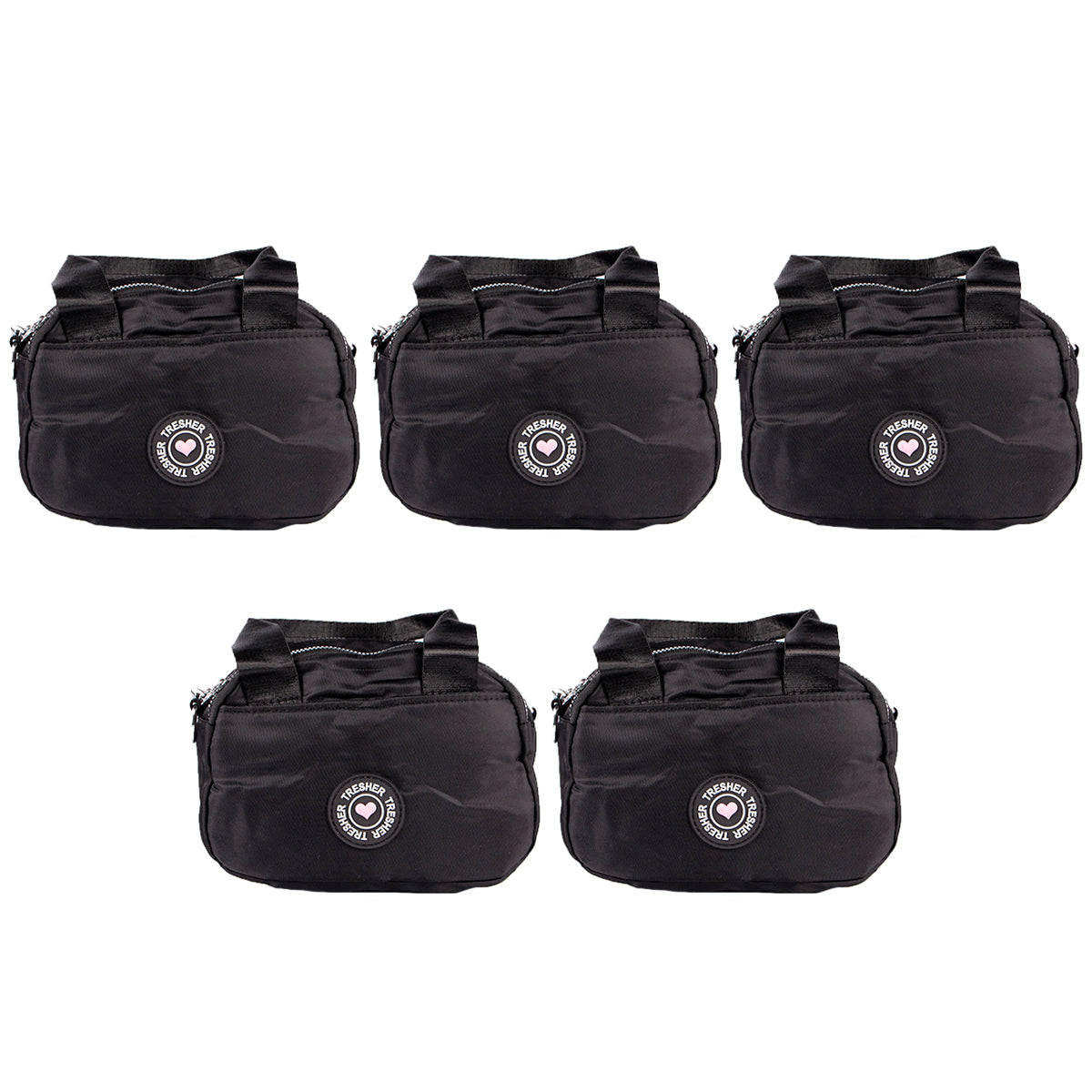 Contiene cinco bandoleras de un mismo modelo en color negro.
