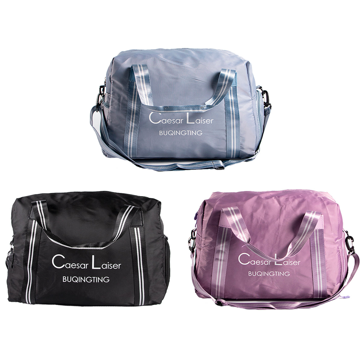 Contiene tres bolsos de viaje de un mismo modelo en diferentes colores.