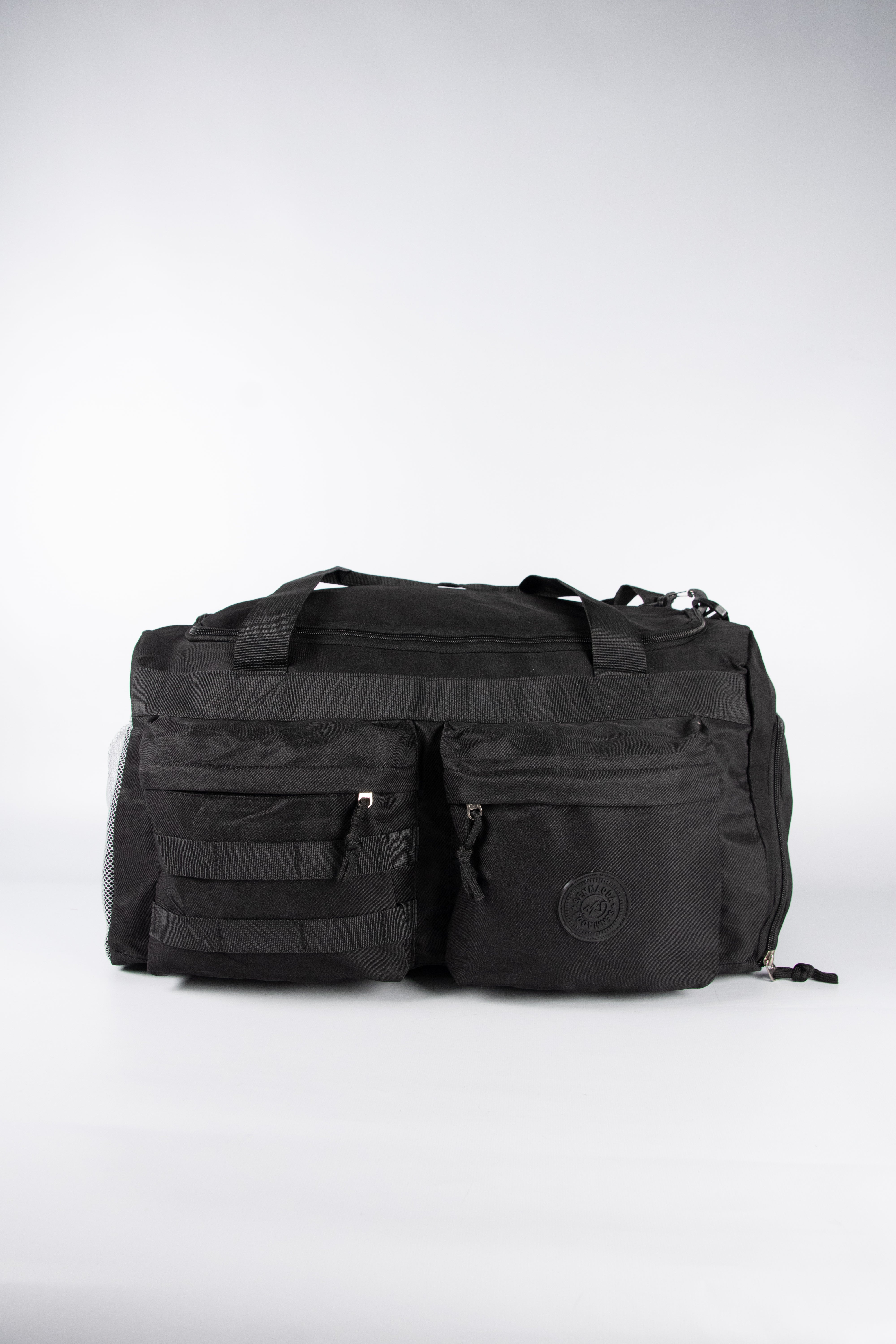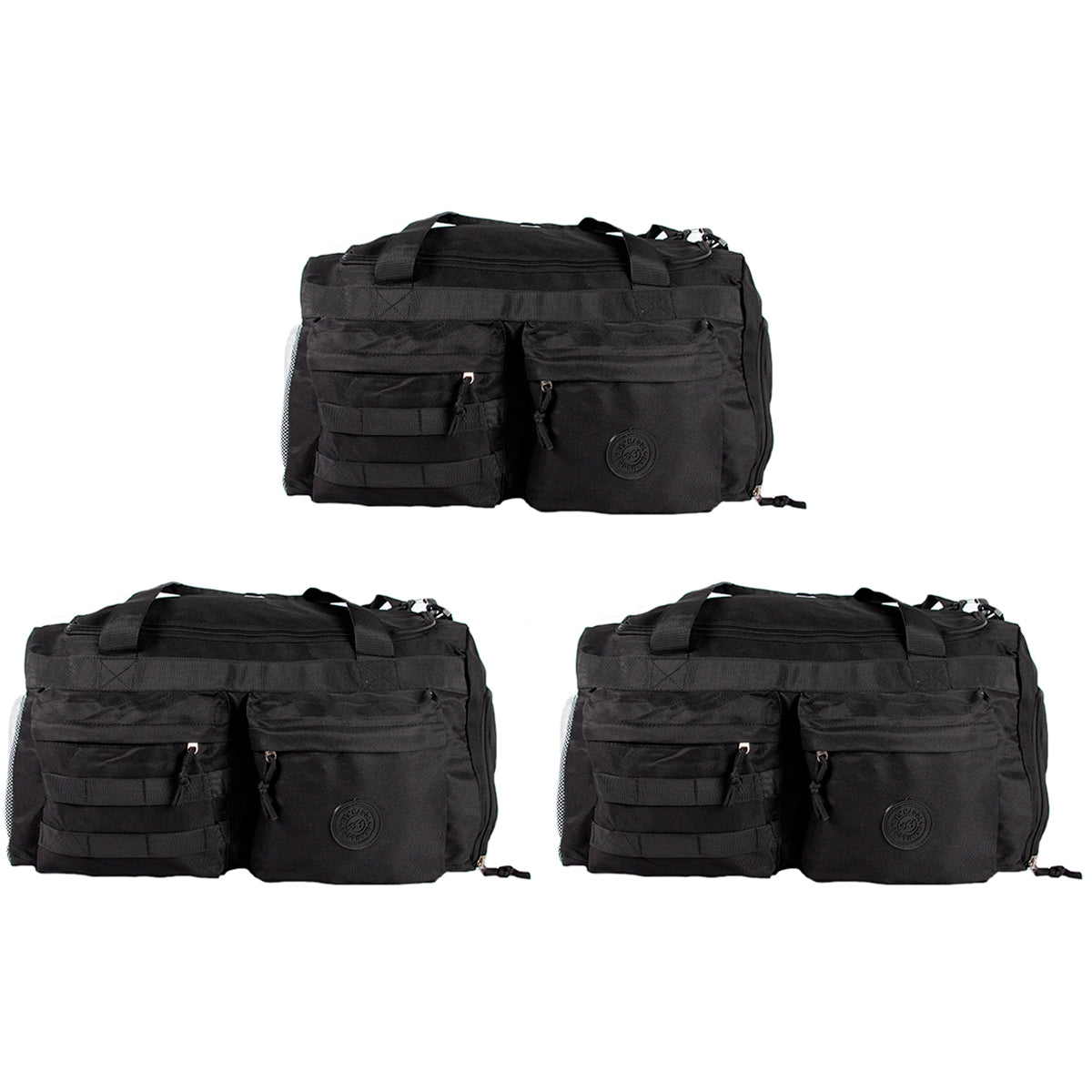 Contiene tres bolsos de viaje de un mismo modelo en color negro.