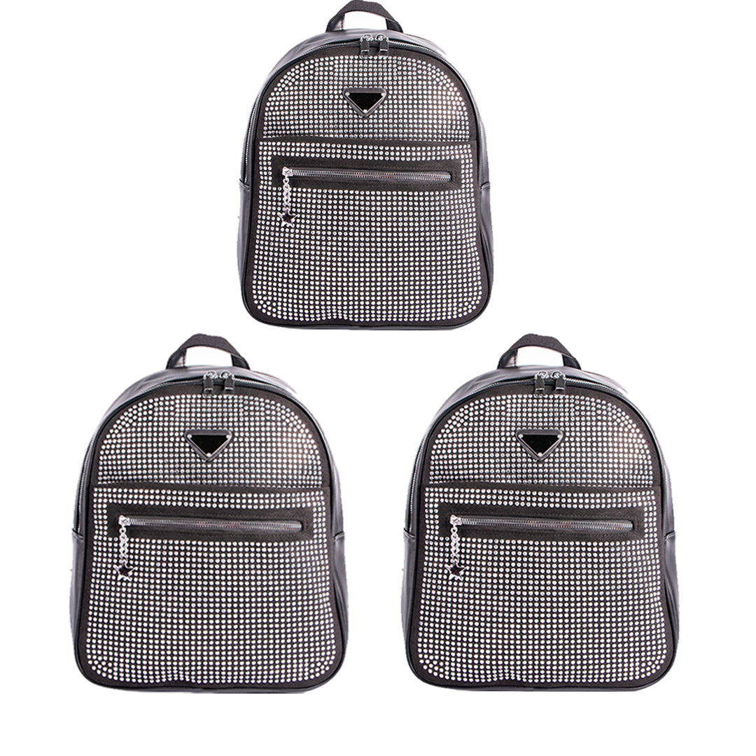 Contiene tres mochilas importadas con strass de un mismo modelo en color plateado.