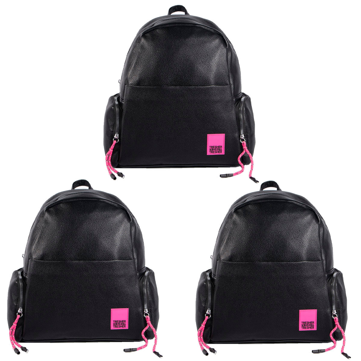 Contiene 3 mochilas nacionales de un mismo modelo en color negro con detalles fucsia.