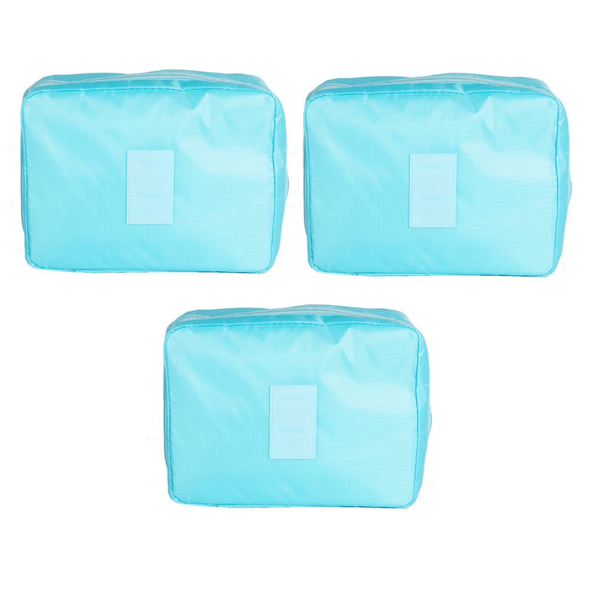 Contiene 3 portacosméticos de un mismo modelo en color celeste .