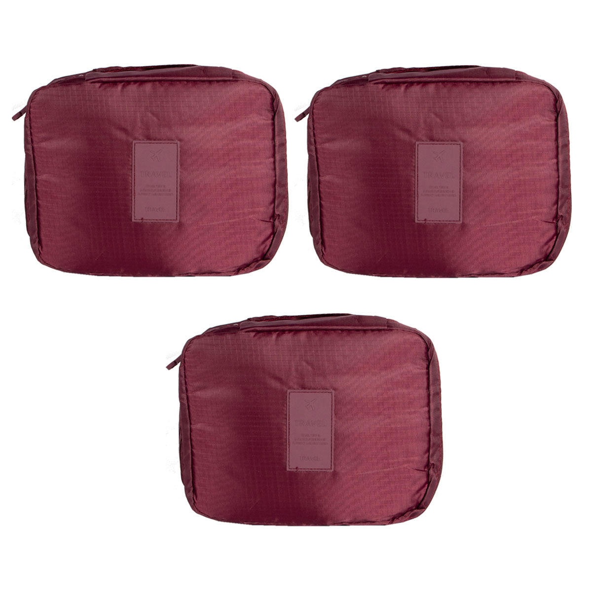 Contiene 3 portacosméticos de un mismo modelo en color bordo.