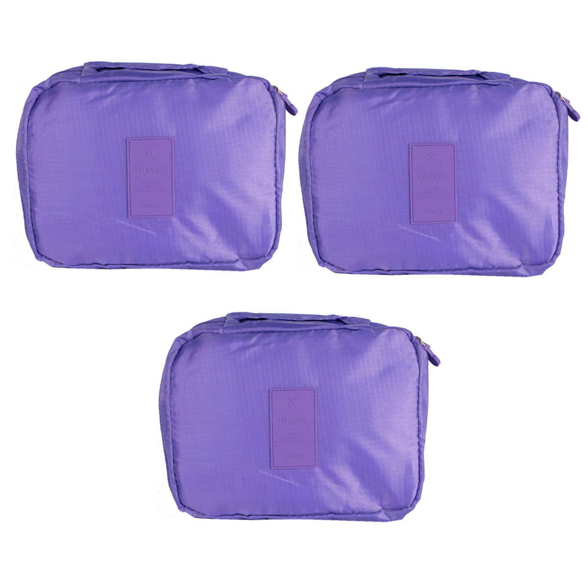 Contiene 3 portacosméticos más vendidos de un mismo modelo en color violeta.