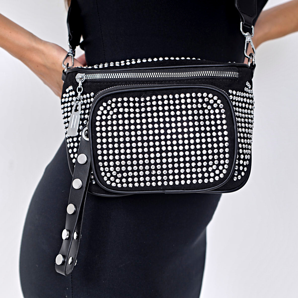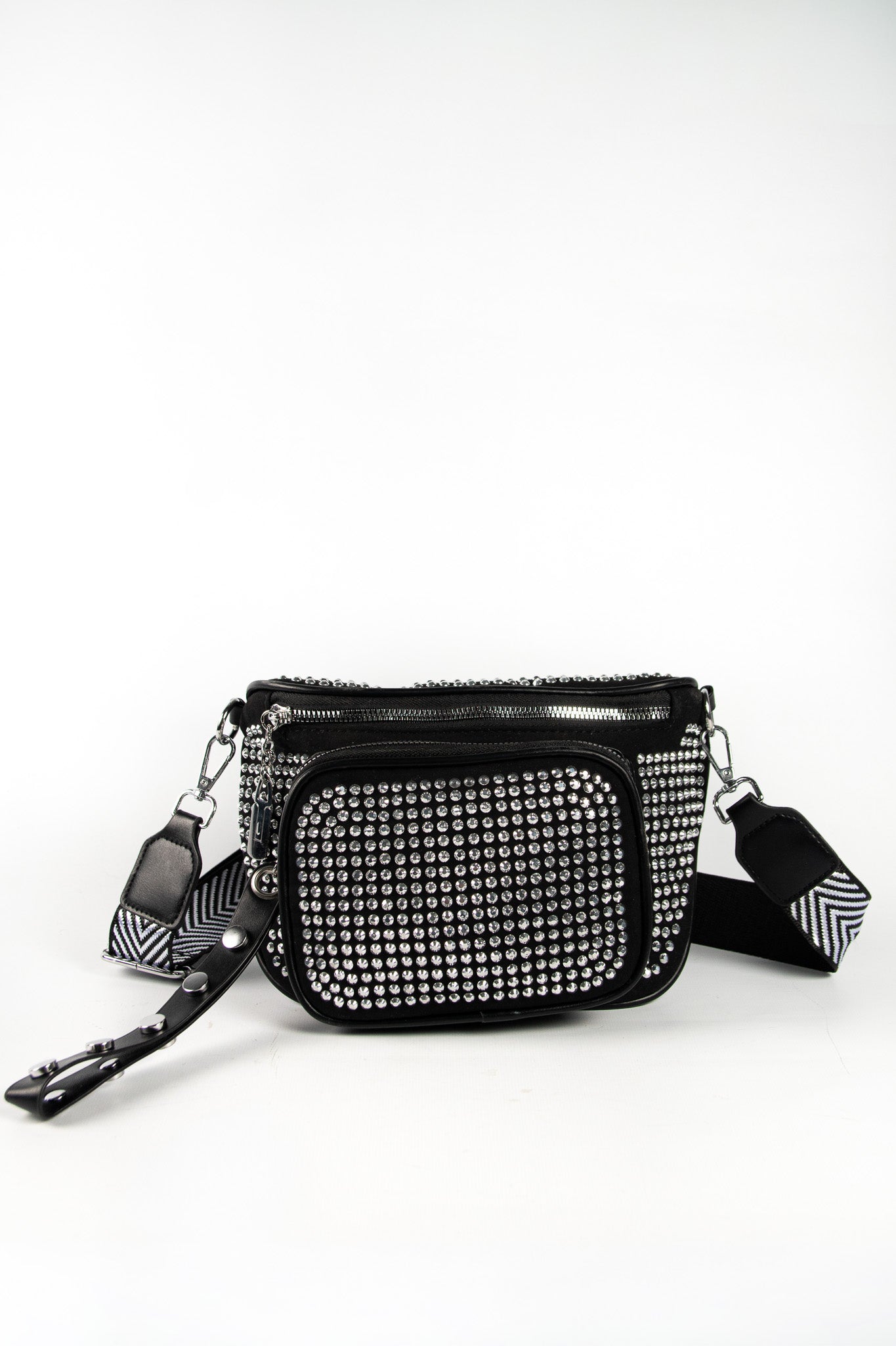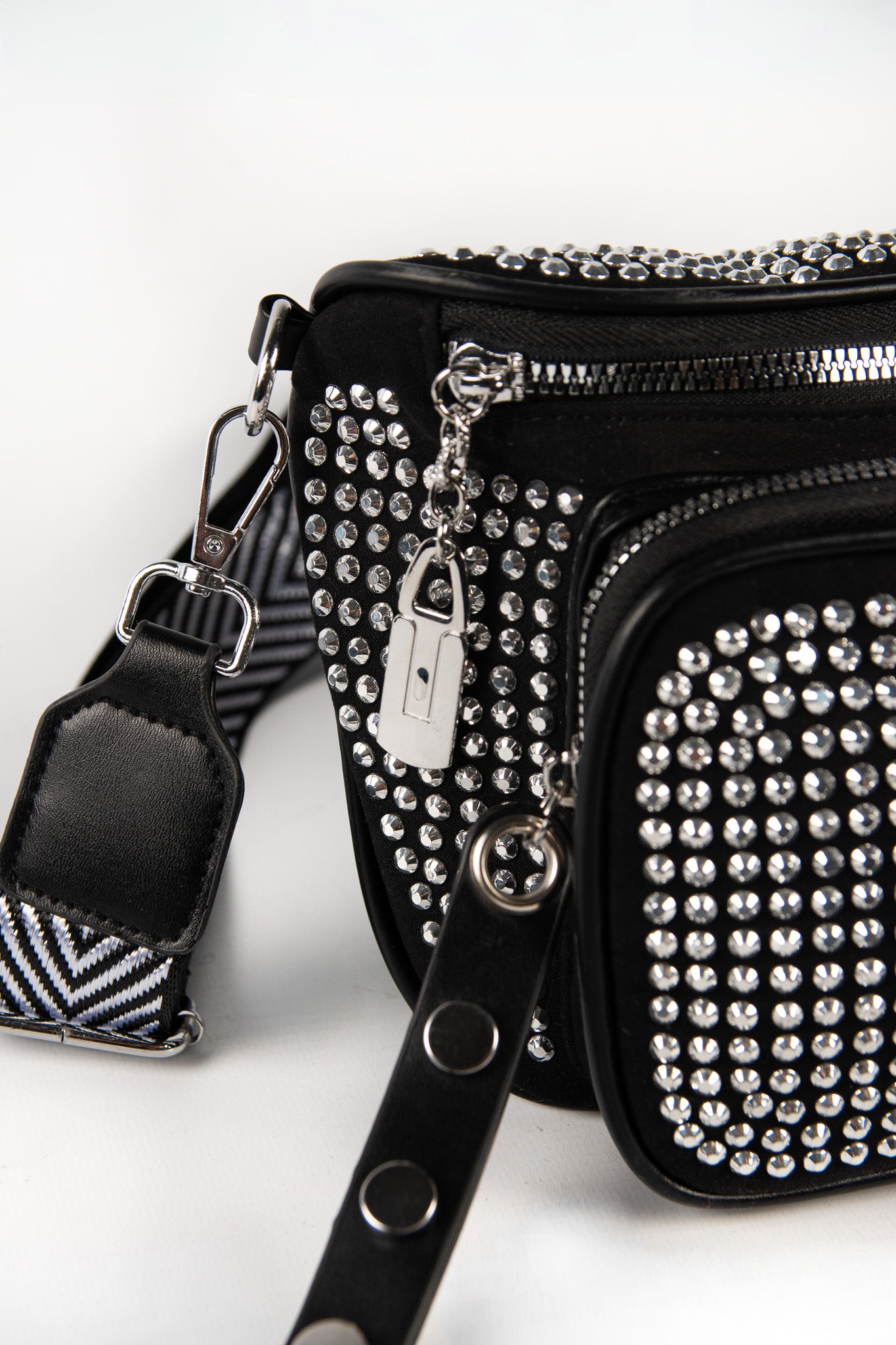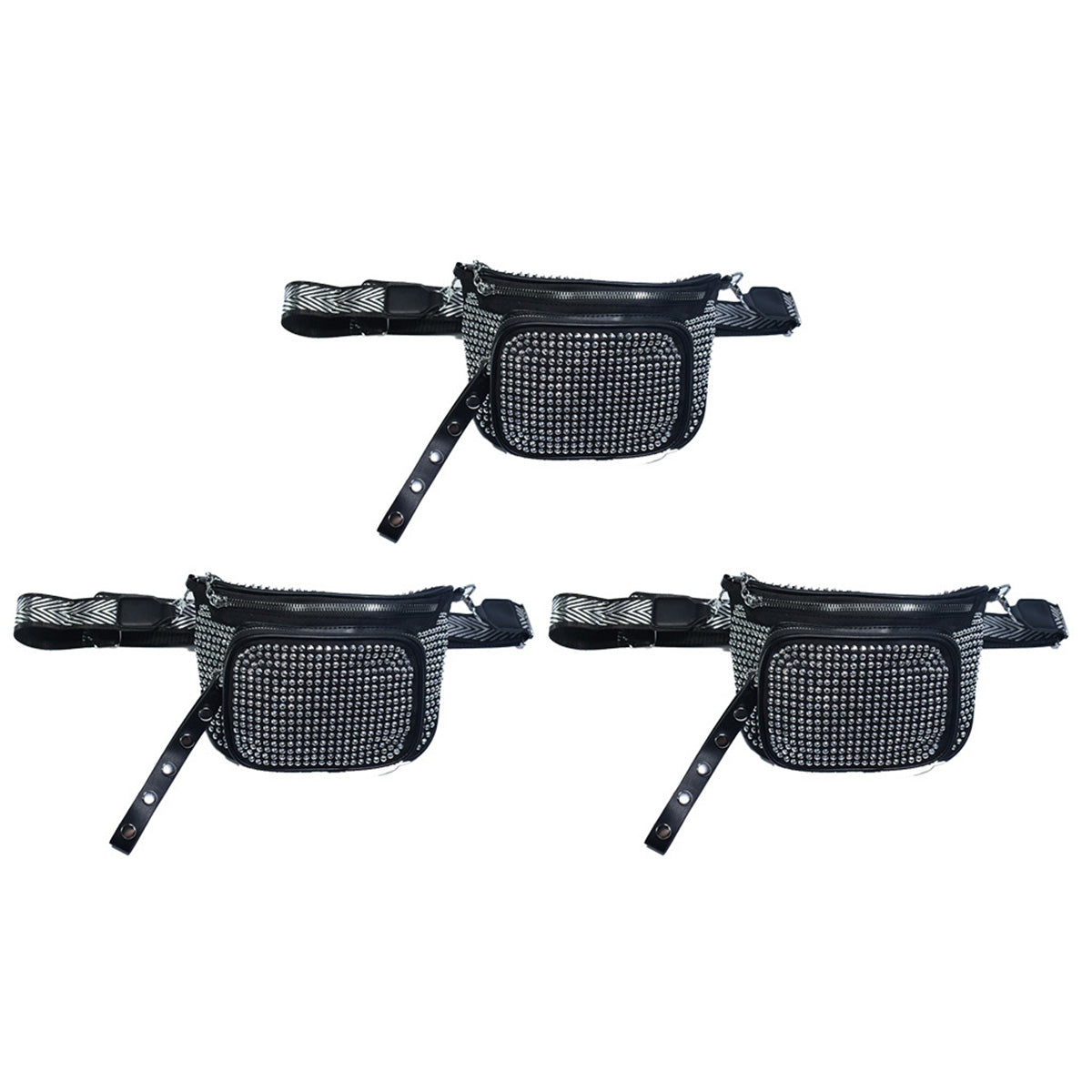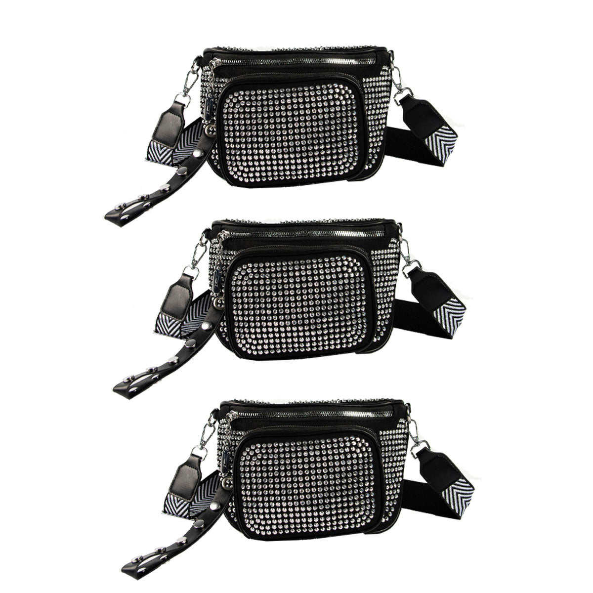 - Contiene: 3 riñoneras con strass plateado de un mismo modelo con correa estampada.