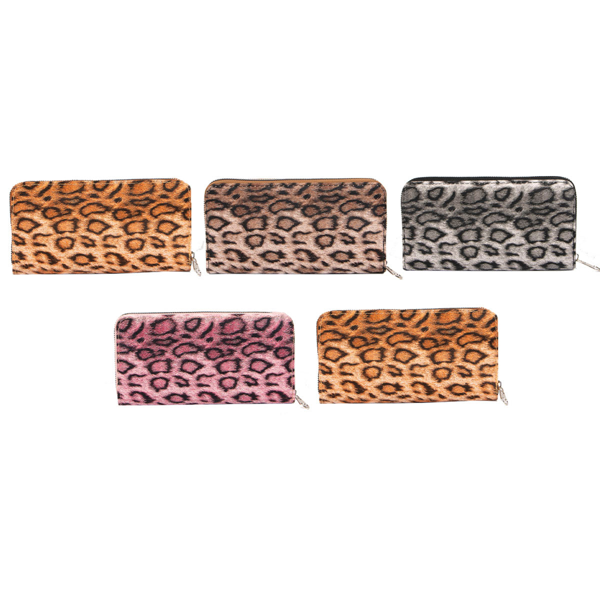 Contiene cinco billeteras animal print de un mismo modelo en diferentes modelos.