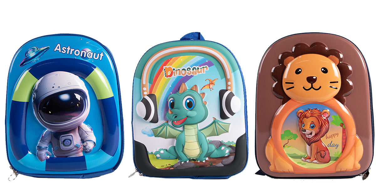 Contiene cinco mochilas infantiles de diferentes modelos.