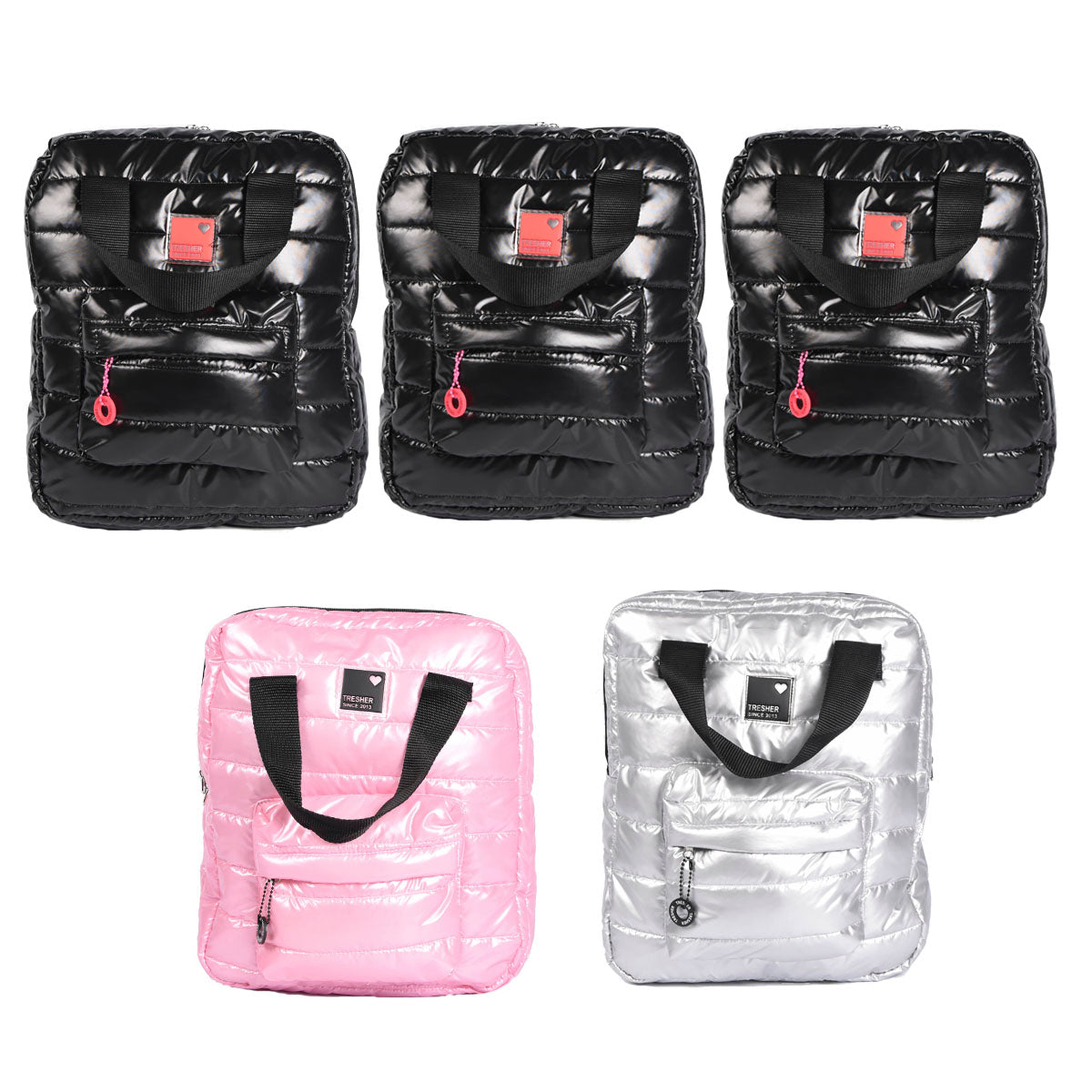 Contiene cinco mochilas puffer grandes de un mismo modelo en diferente color.