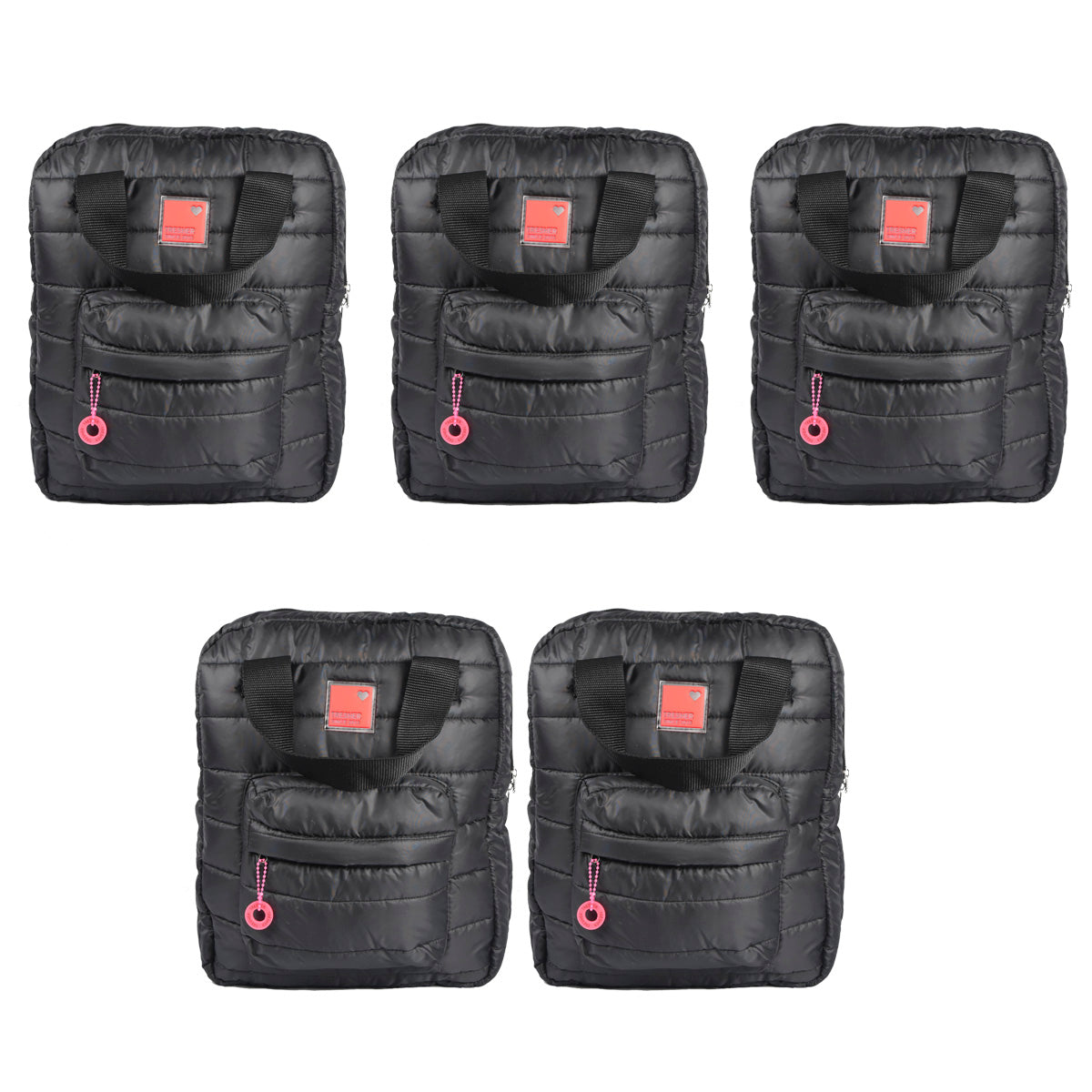 Contiene cinco mochilas puffer de un mismo modelo y color.