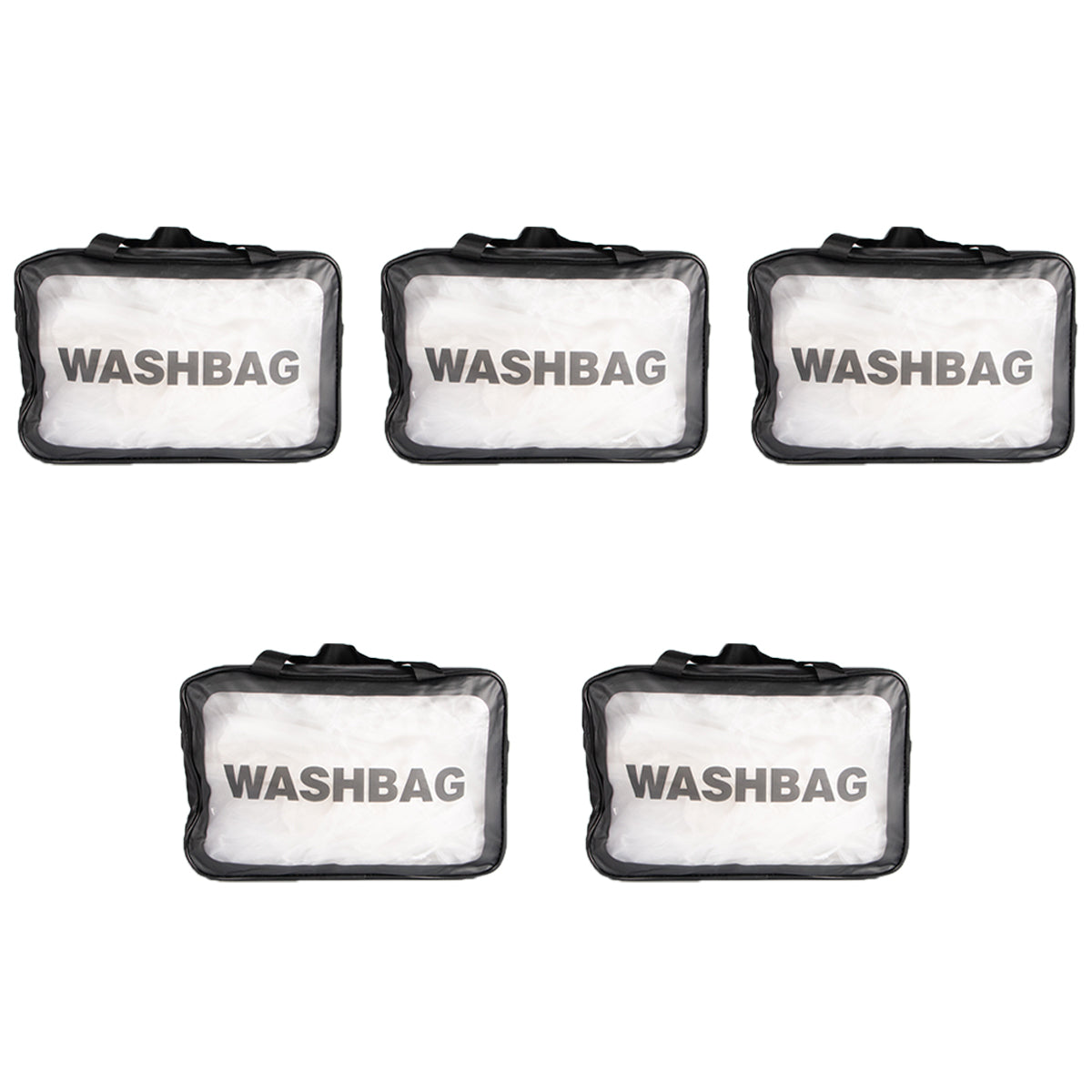 Contiene cinco portacosméticos de un mismo modelo en color negro.