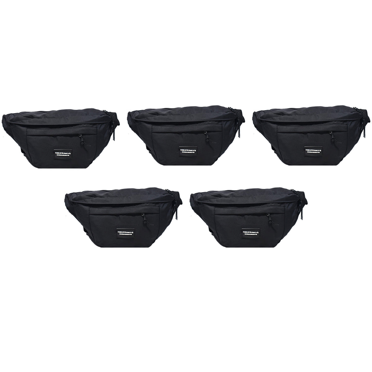 Contiene cinco riñoneras chicas de un mismo modelo en color negro.