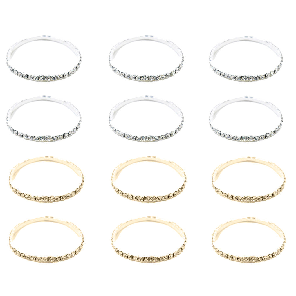- Contiene: 12 pulseras de strass mixtas (doradas y plateadas)