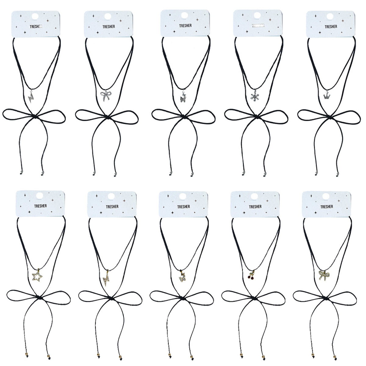 Contiene diez collares corbateros con dije de strass mixtos de diferentes modelos en plateado y dorado.
