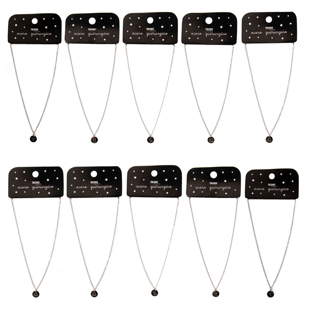 Contiene 10 collares de acero quirúrgico de un mismo modelo en color plateado.