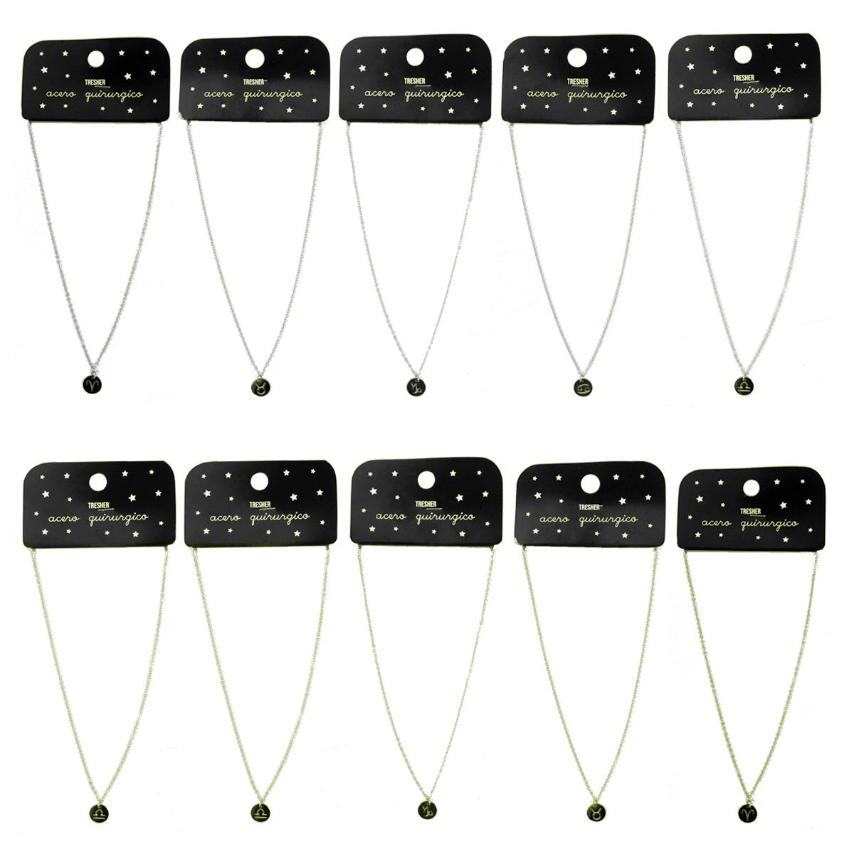 Contiene 10 collares de acero quirúrgico de un mismo modelo mixto se envían cinco plateado y cinco dorados .