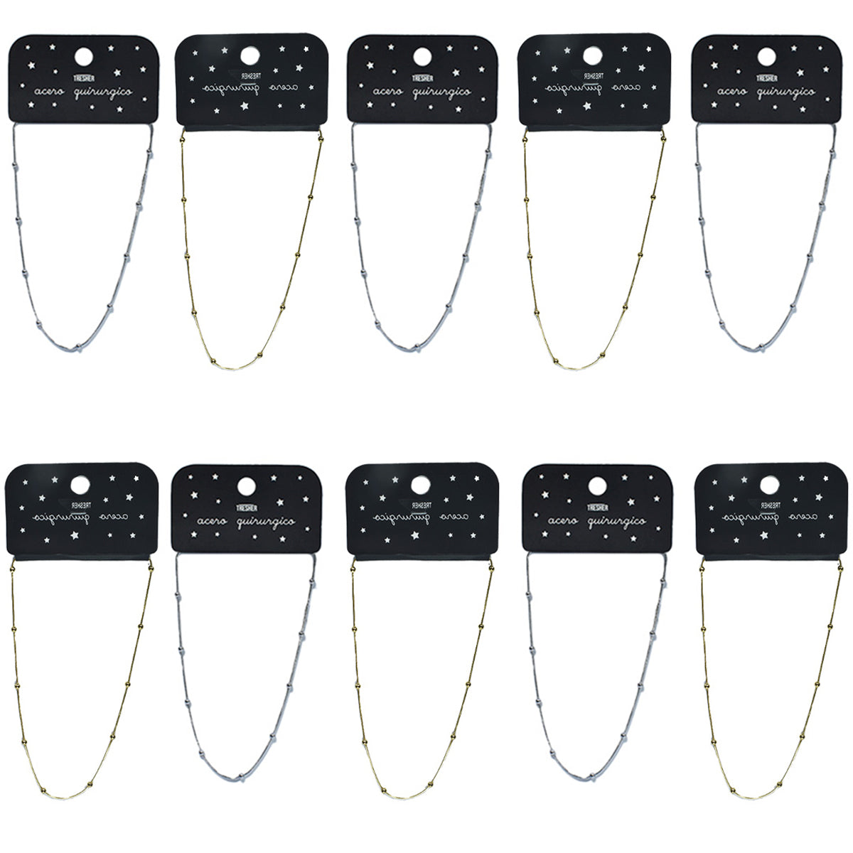 Contiene diez collares de acero quirúrgico de un mismo modelo en plateado y dorado.