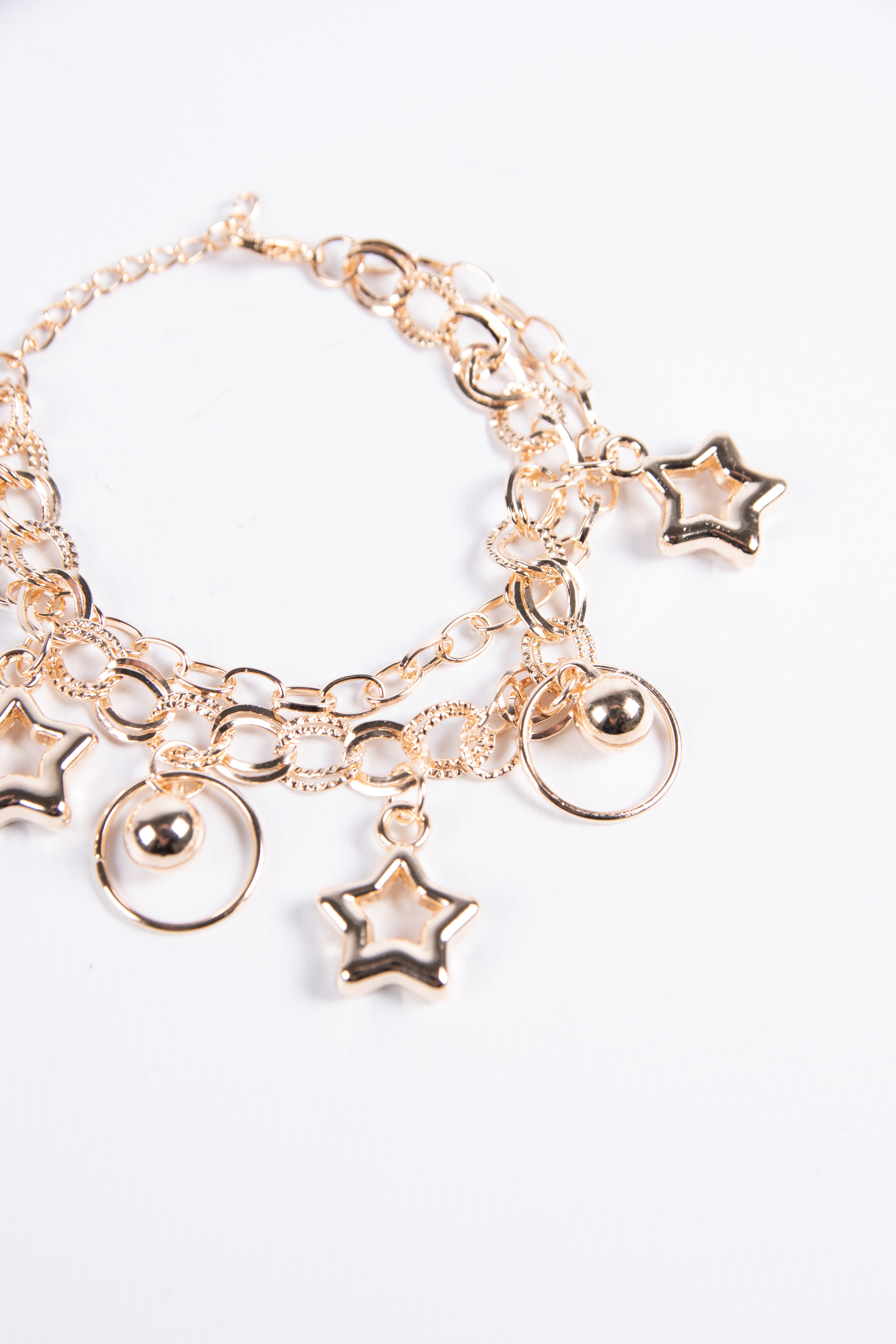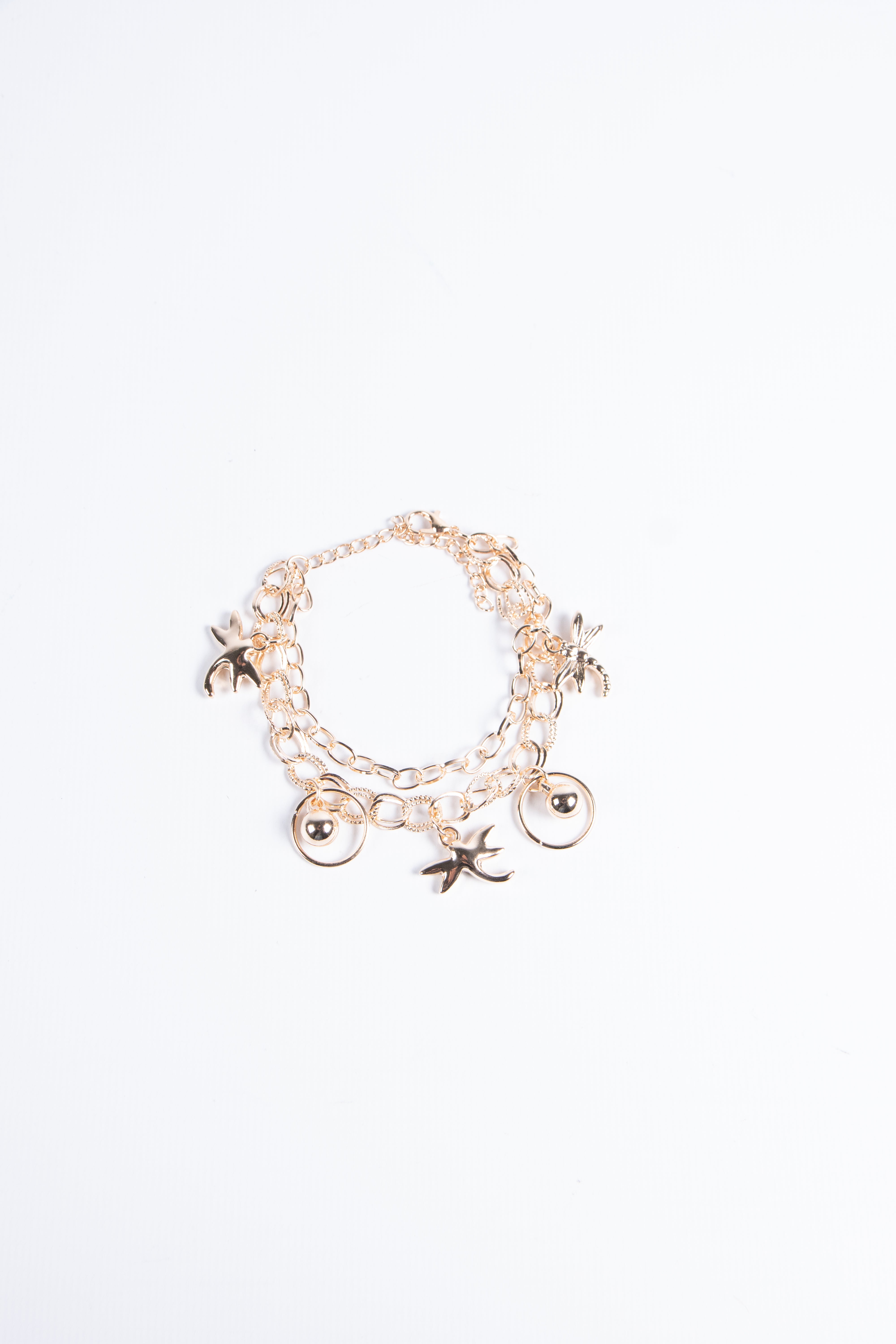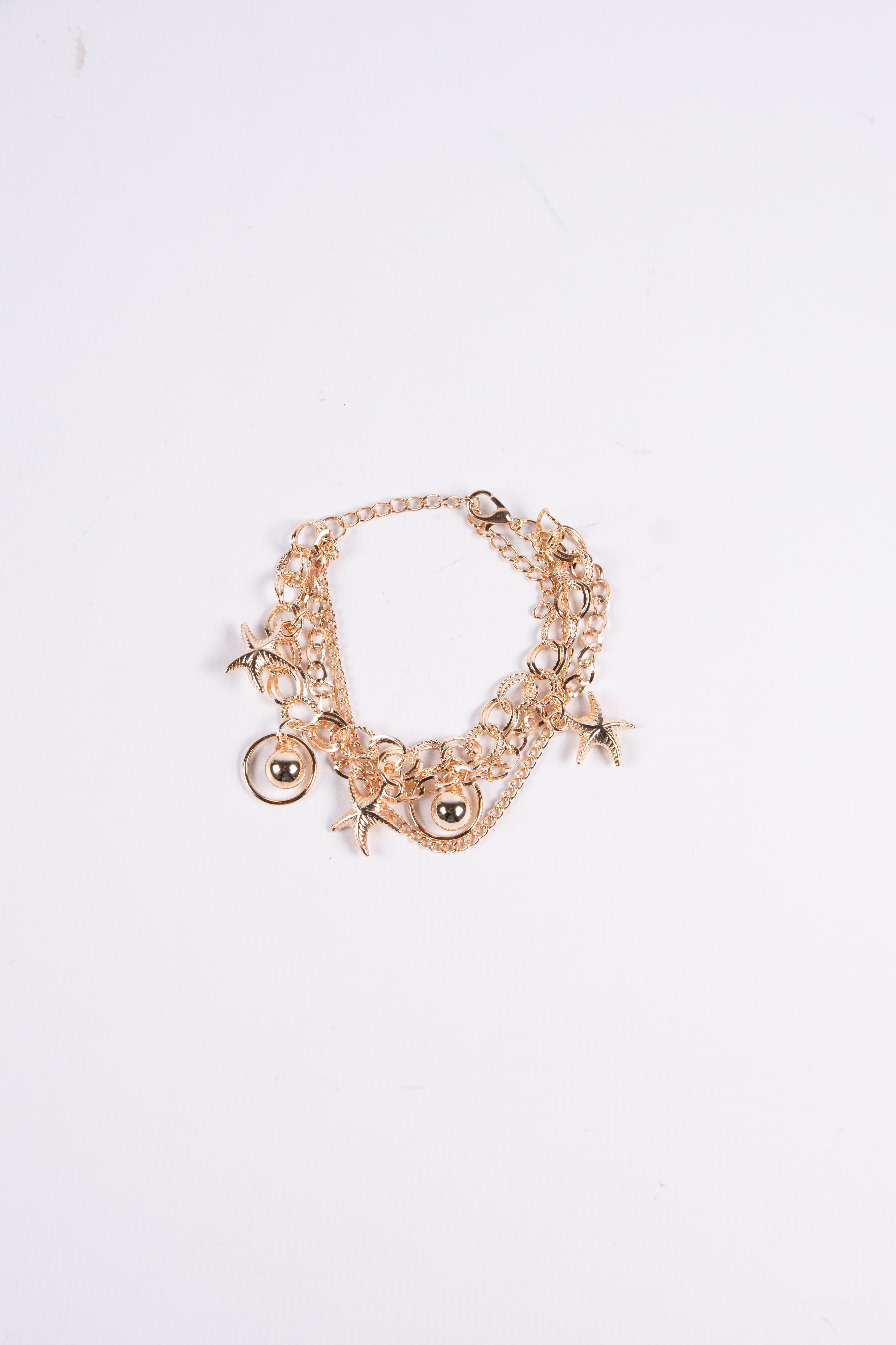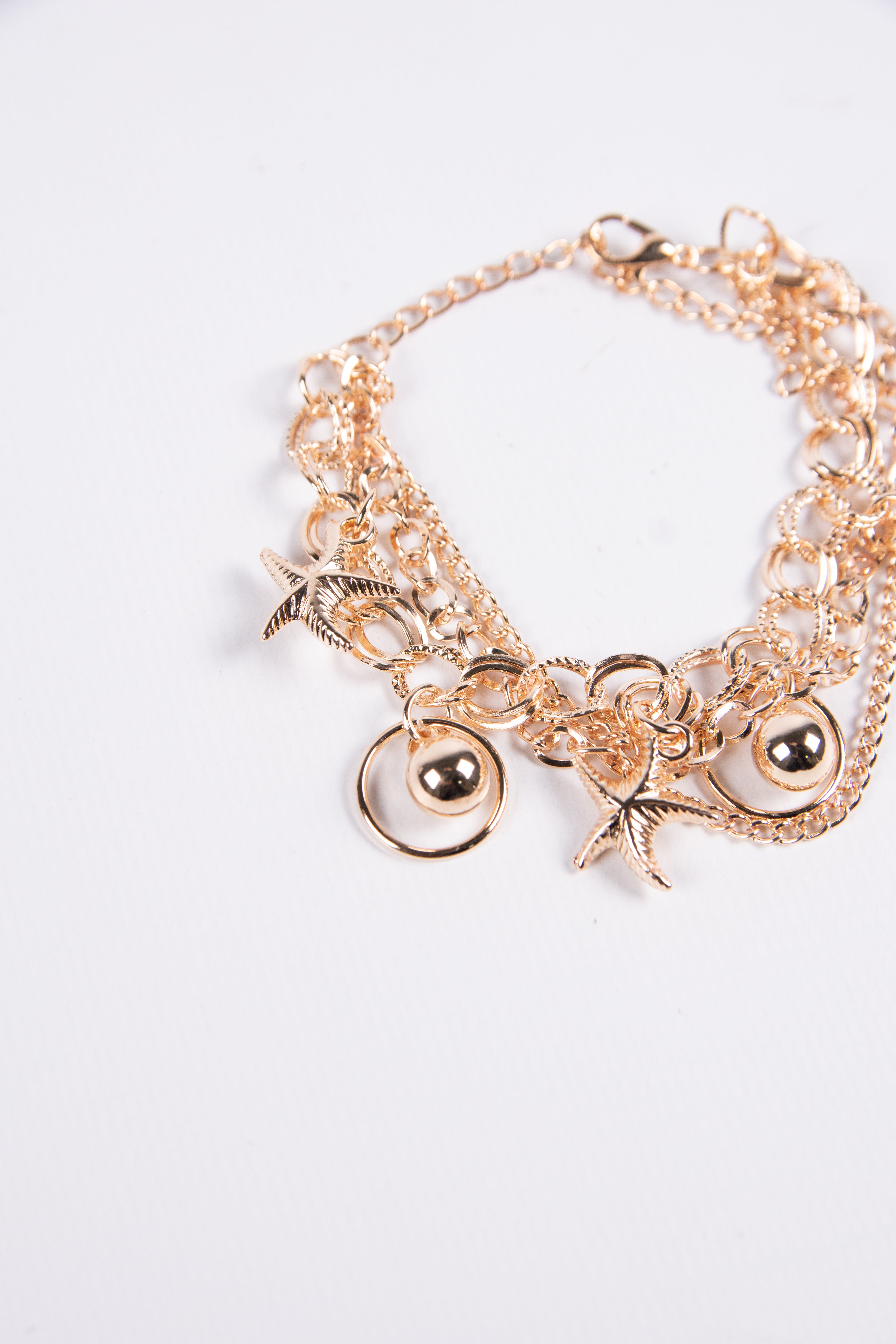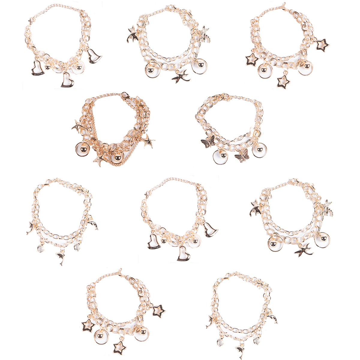 Contiene diez pulseras de fantasía de diferentes modelos en dorado.