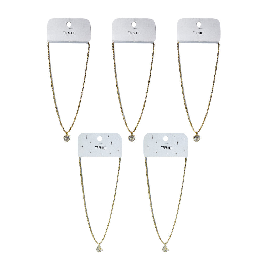 contiene: 5 collares dorados con dije de strass.Se envía un modelo.