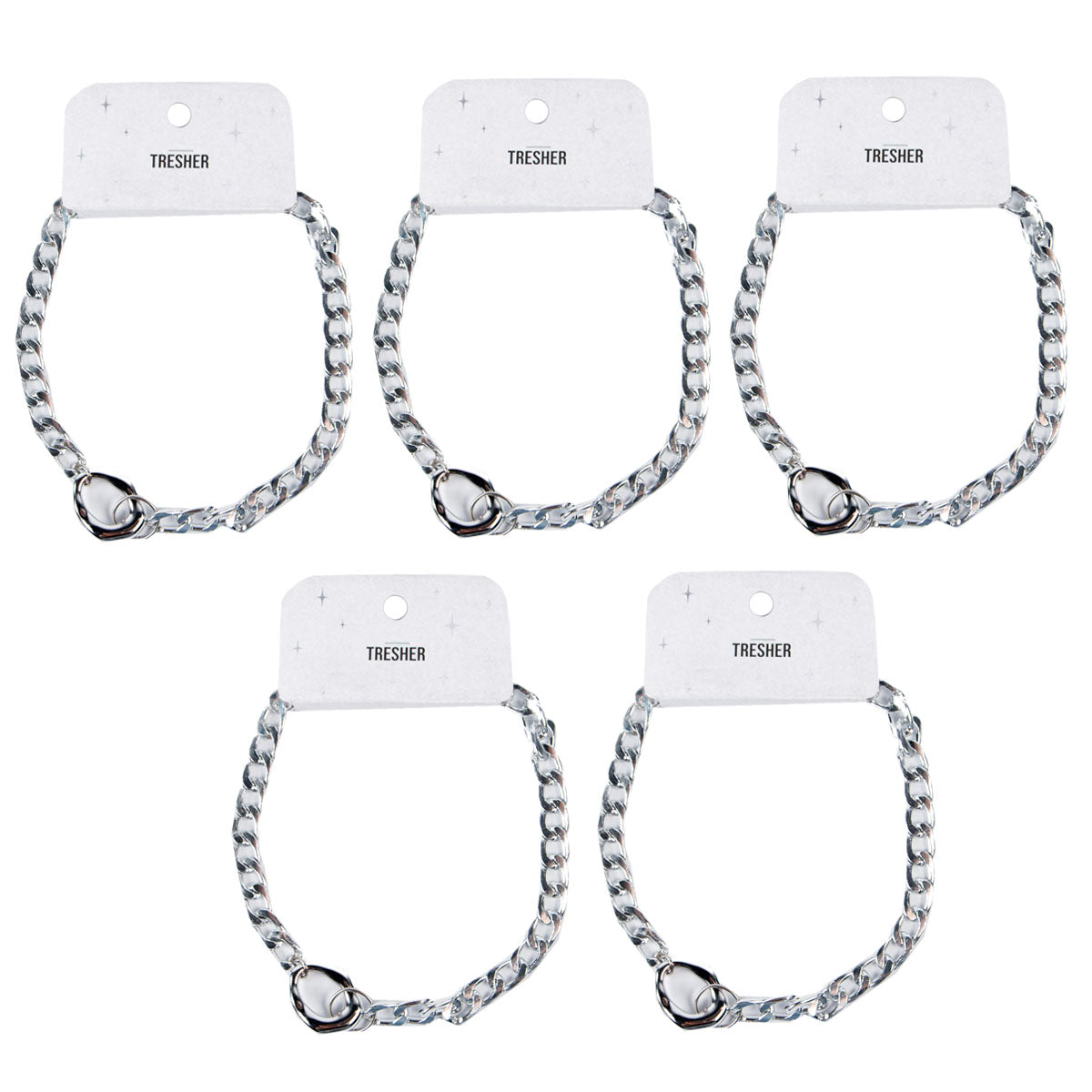 Contiene 5 collares de fantasia de un mismo modelo en color plateado.