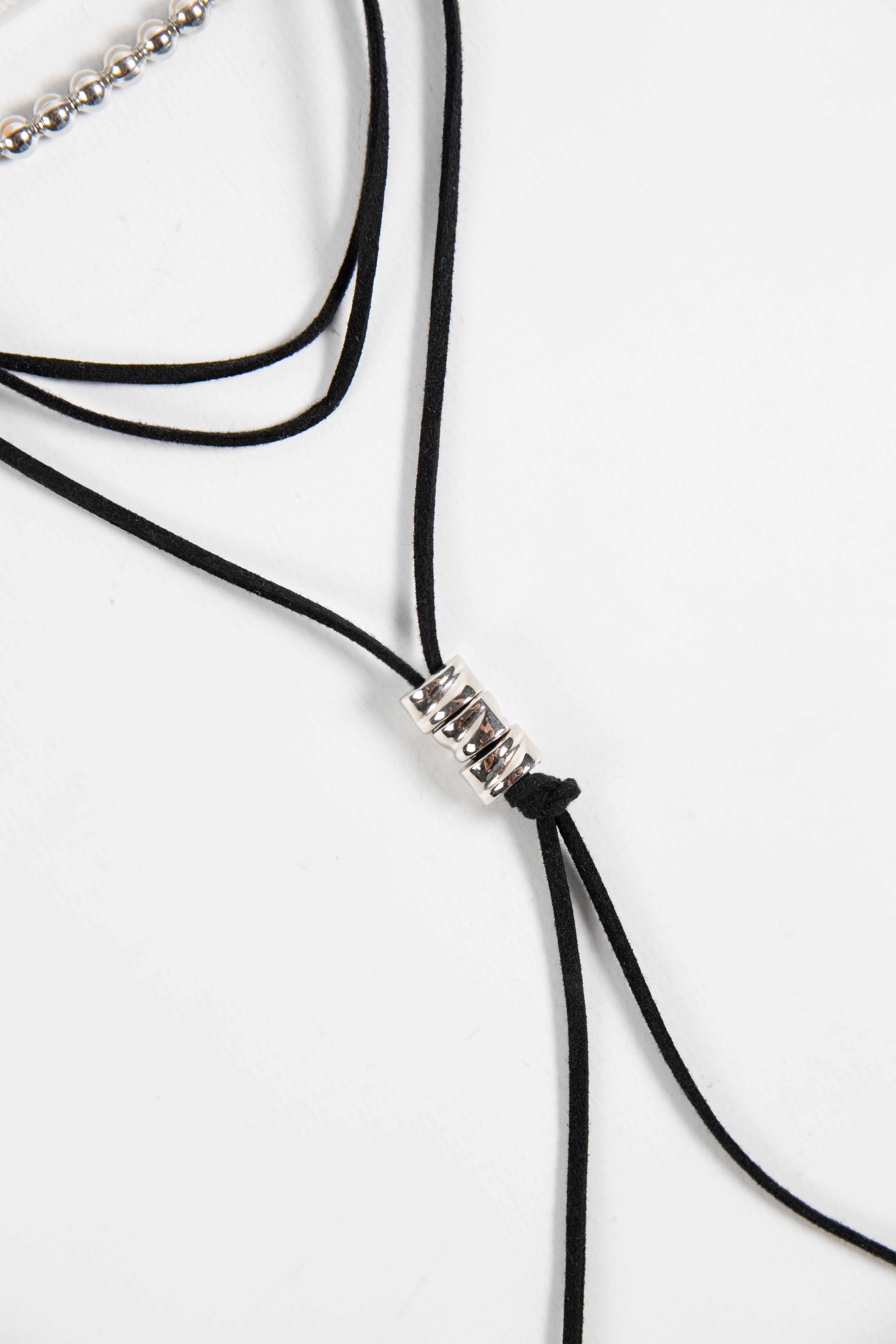 contiene cinco corbatines de un mismo modelo en color negro con dijes plateados.