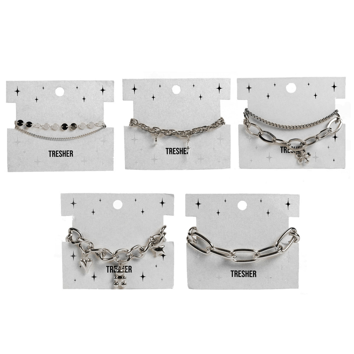 Contiene: 5 pulseras plateadas SURTIDAS, diferentes modelos.