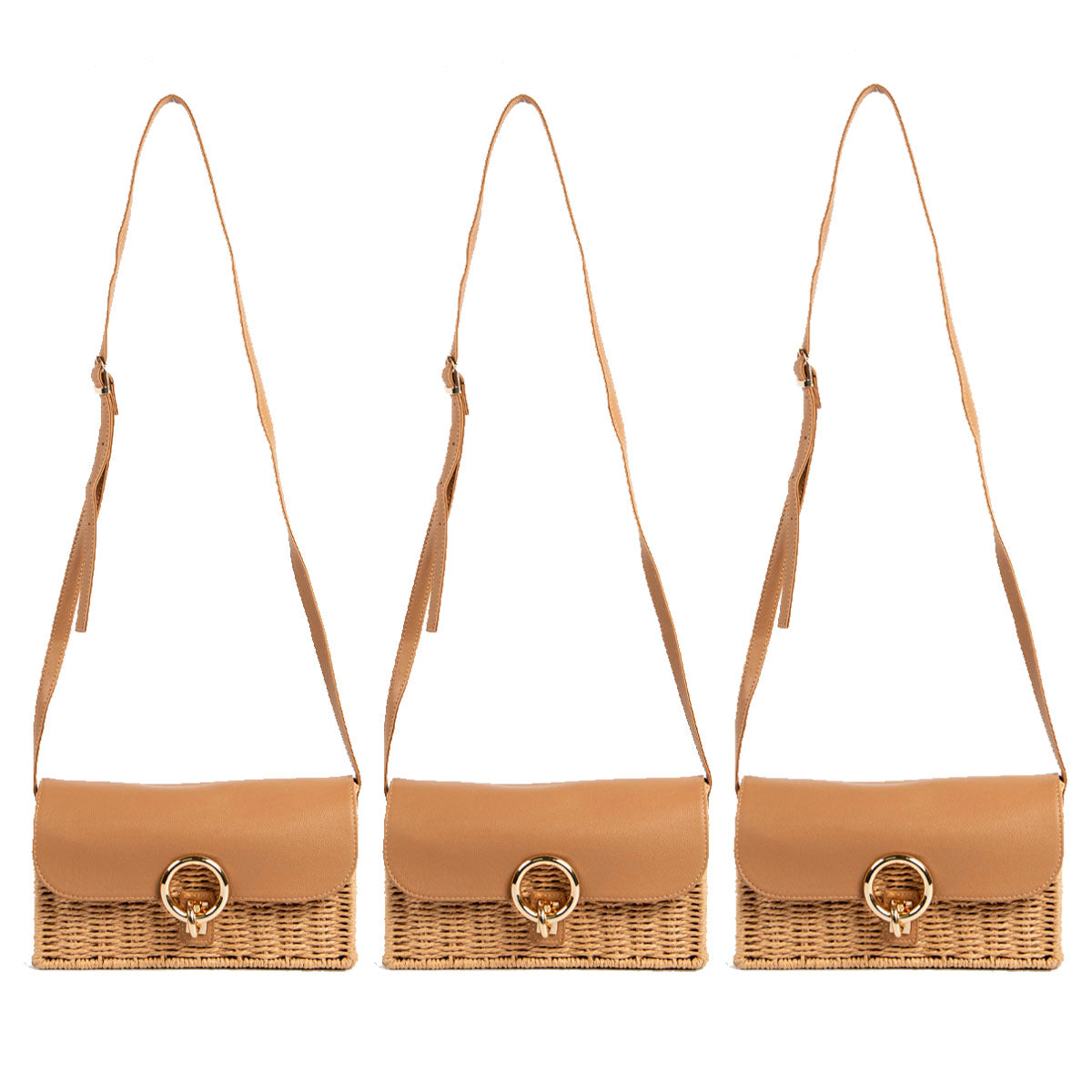 Contiene 3 mini bags de un mismo modelo en color beige con tiras marrón.