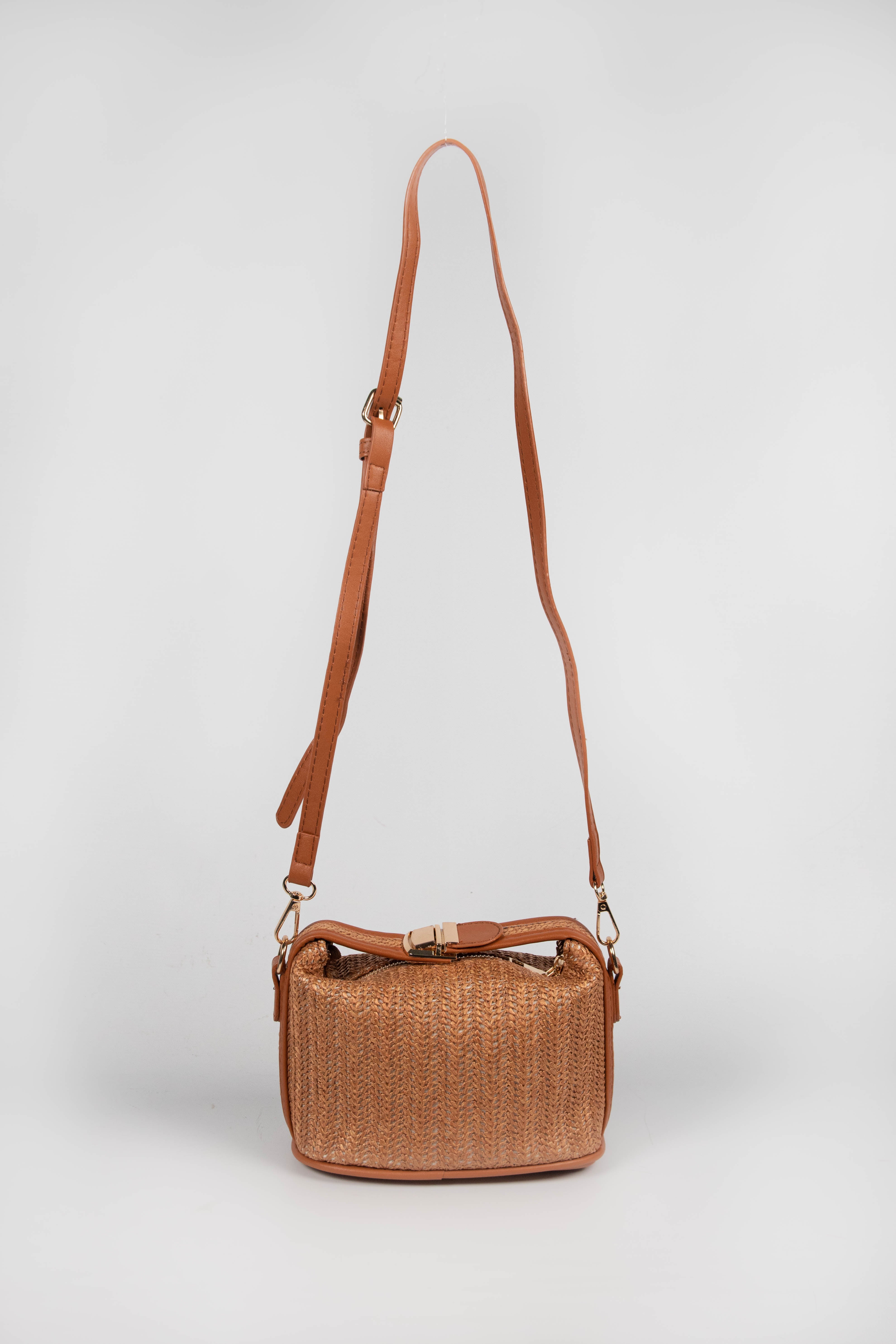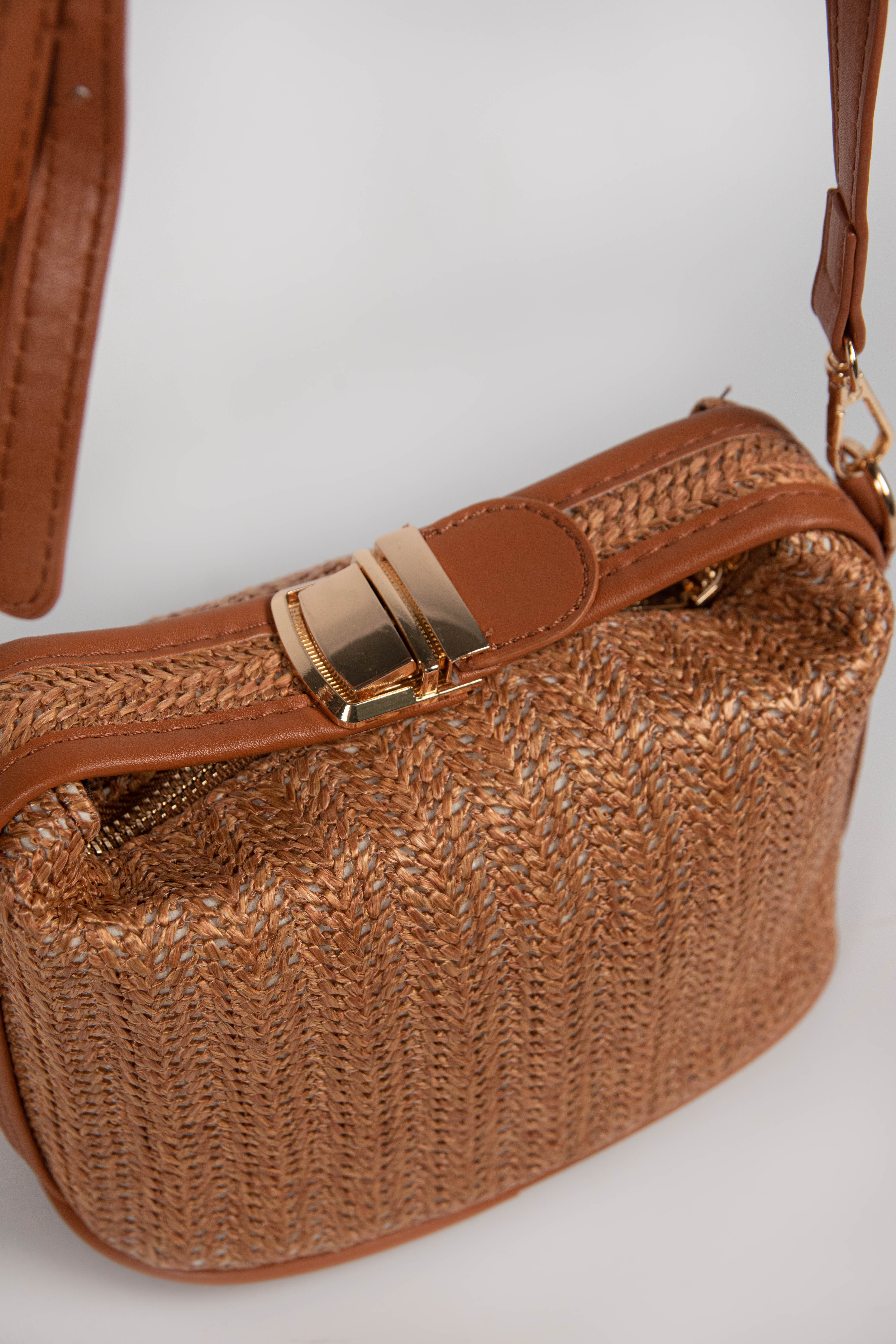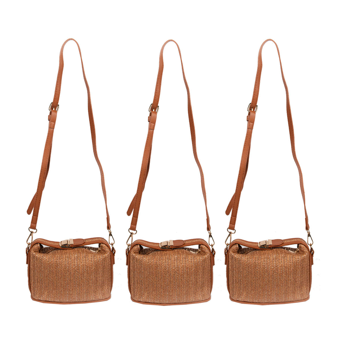 contiene 3 mini bags de rafia de un mismo modelo en color beige oscuro