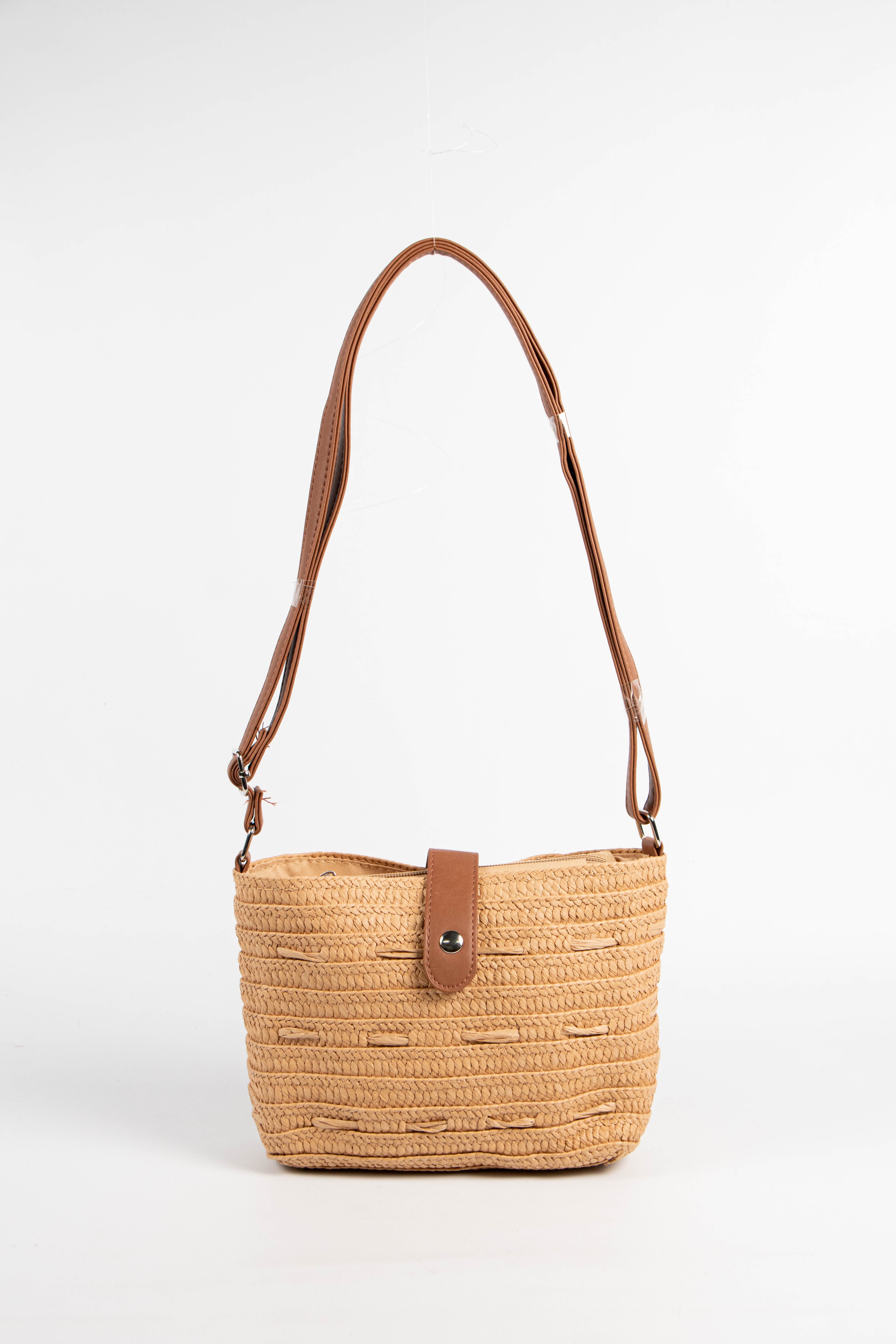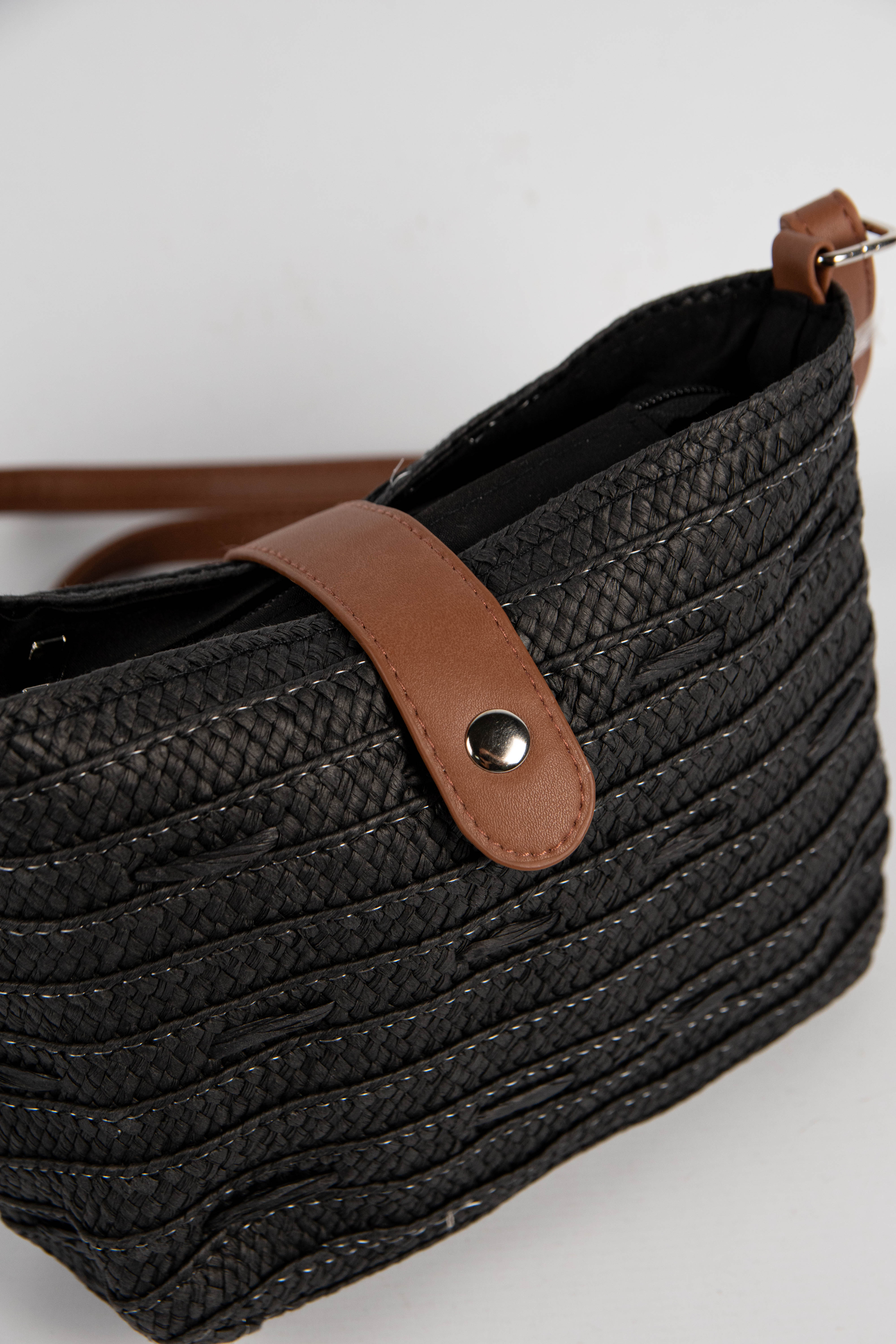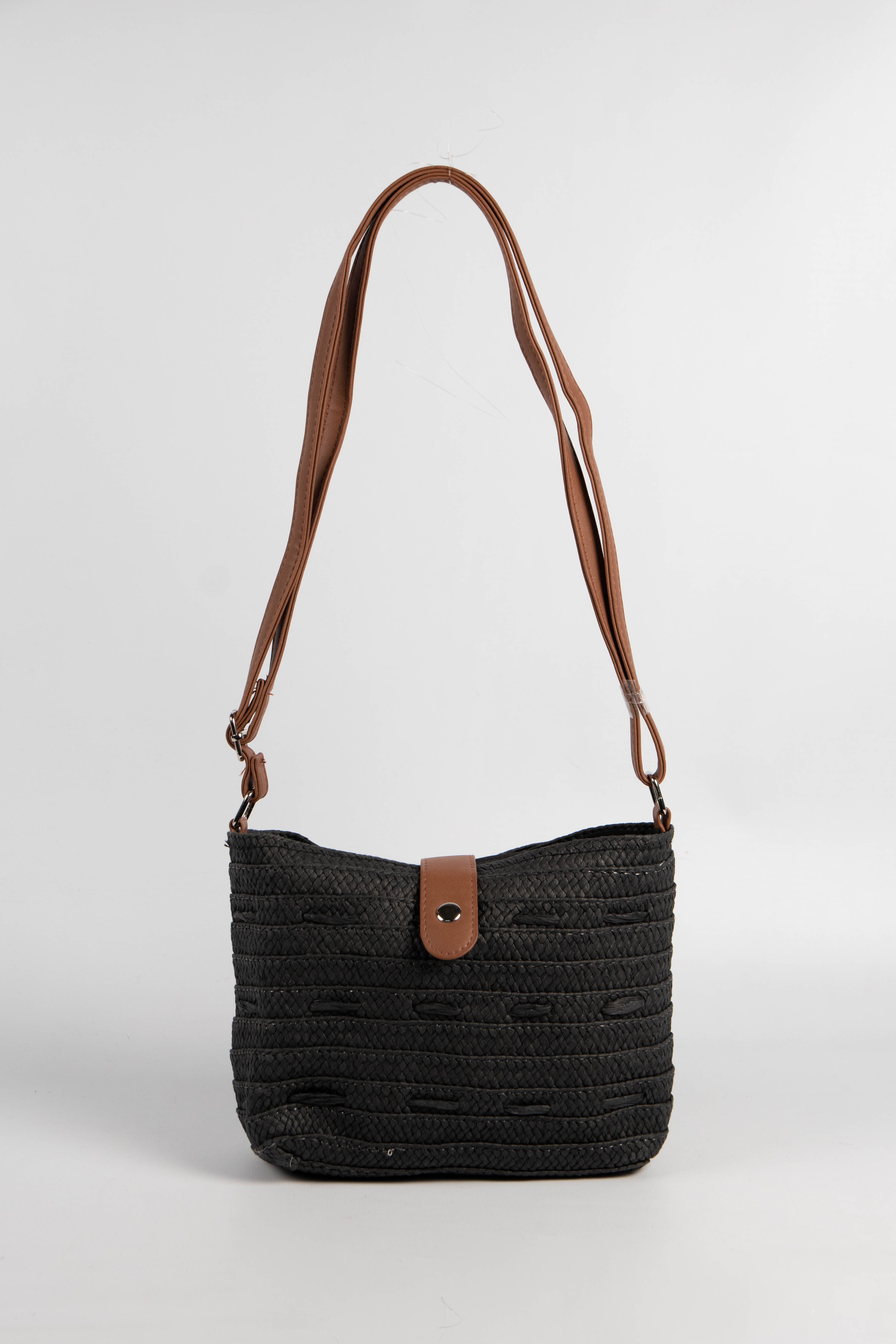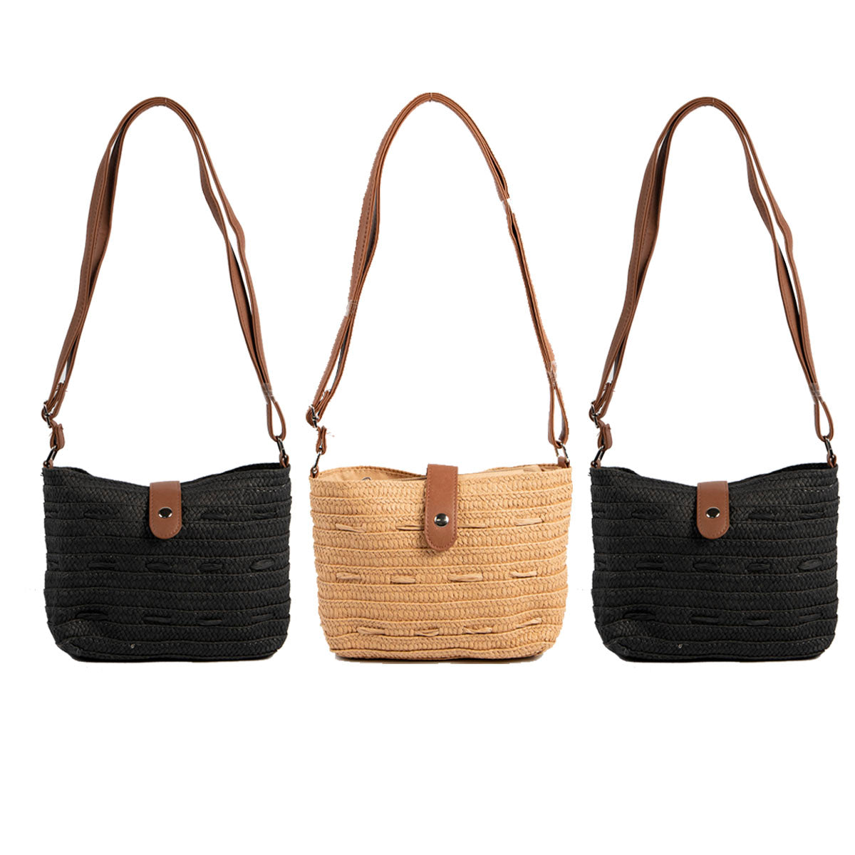 Contiene 3 mini bags de rafia de un mismo modelo en color negro y beige.
