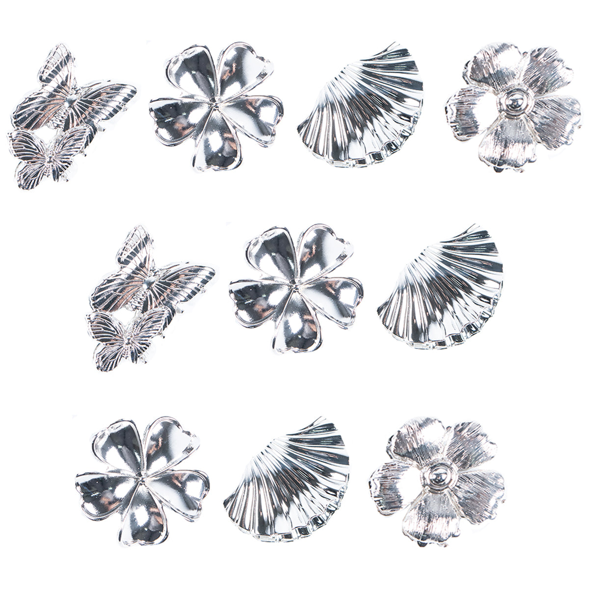 Contiene diez broches de pelo metalizados de diferentes modelos en plateado.