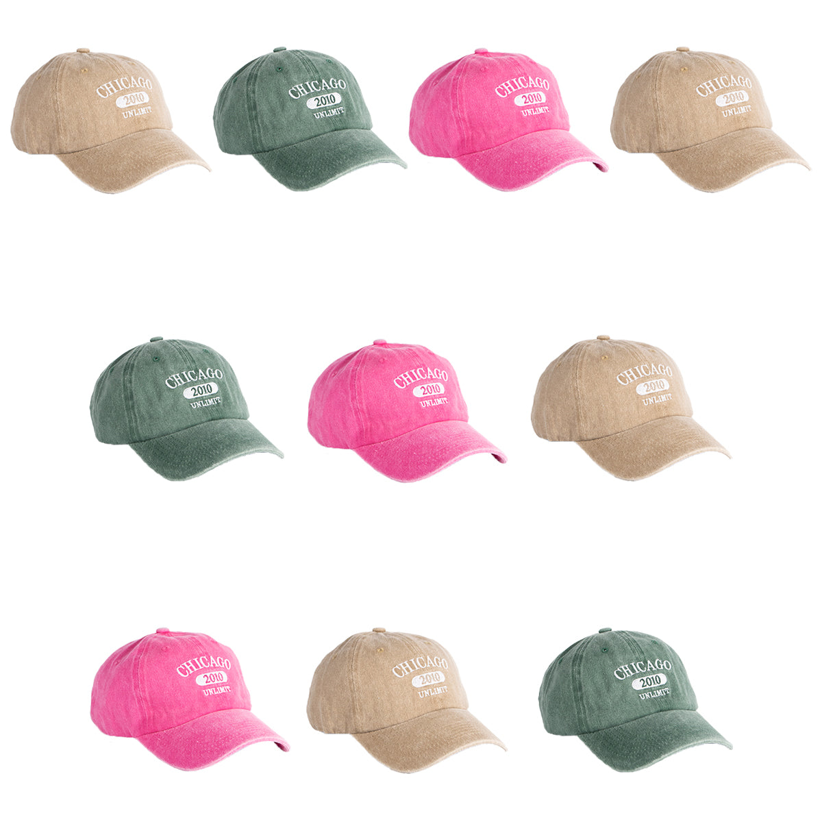 Contiene diez gorras bordadas de un mismo modelo en diferentes colores.