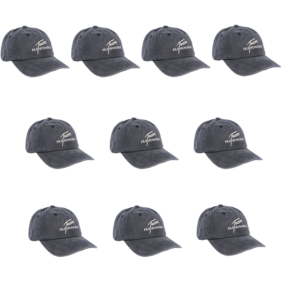 Contiene diez gorras gastadas y bordadas de un mismo modelo en color negro.