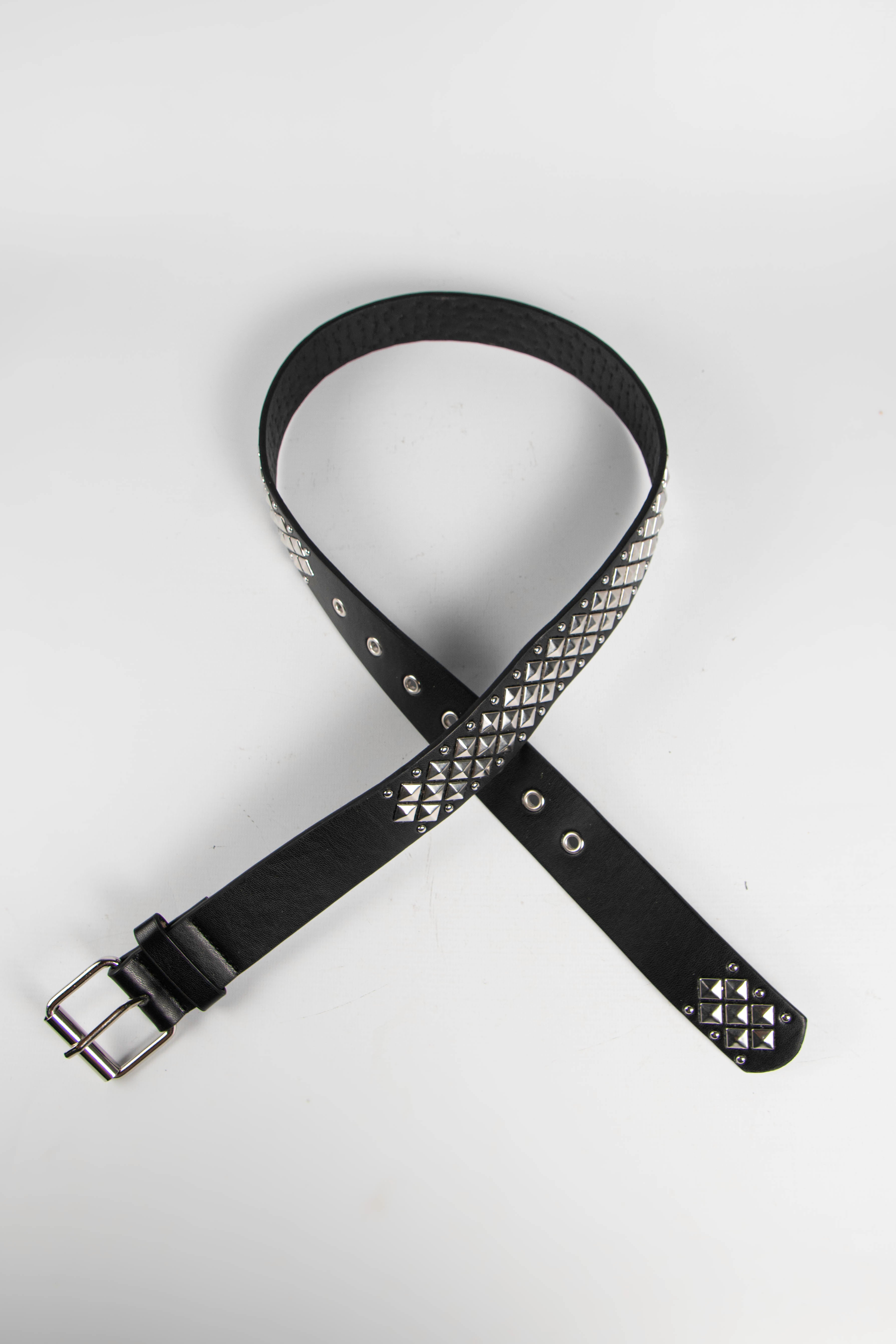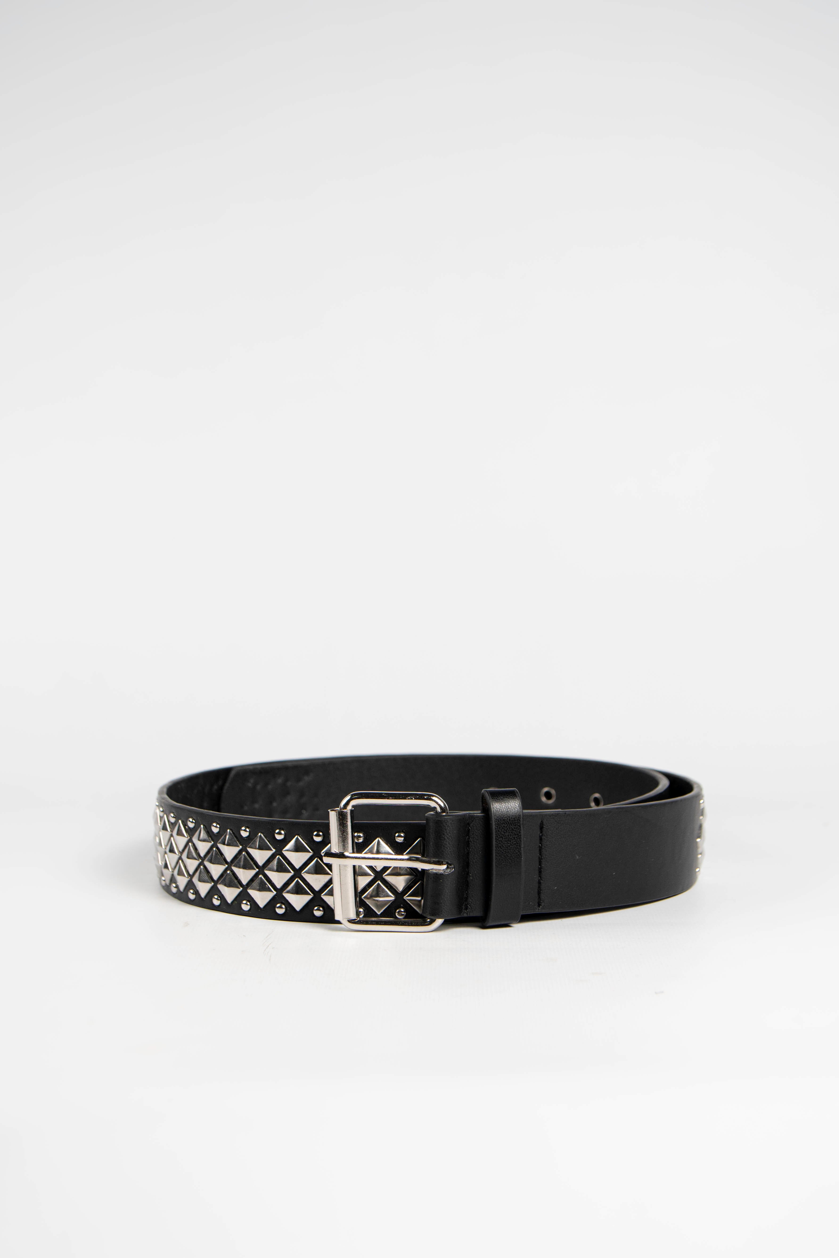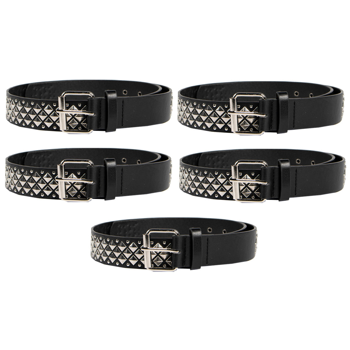 Contiene cinco cintos tacha importados de un mismo modelo en color negro con hebilla plateada.