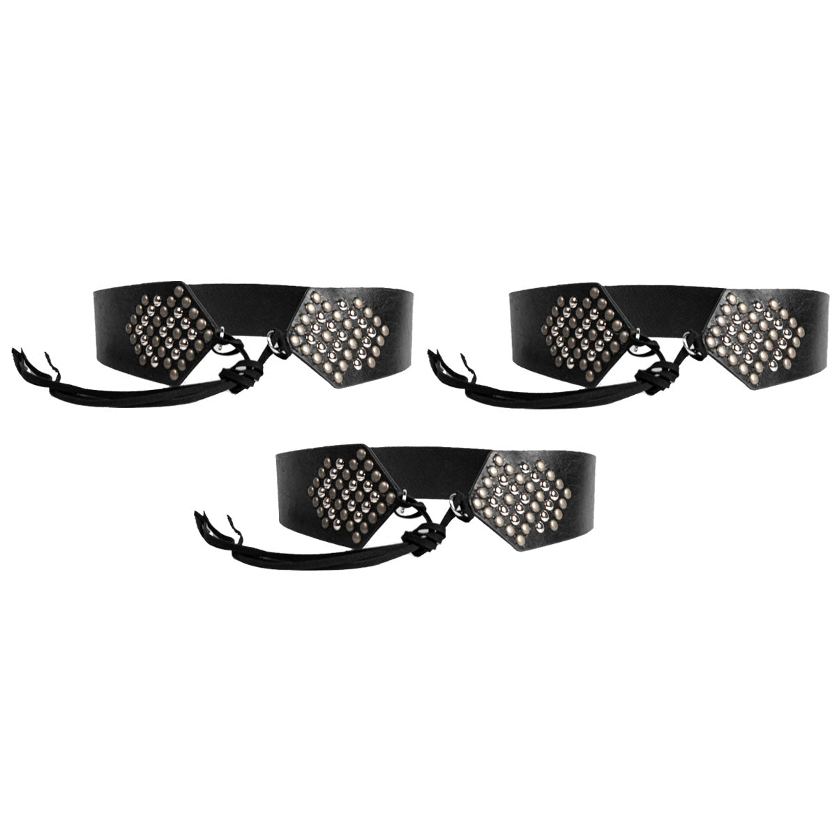 contiene tres cintos faja de un mismo modelo en color negro con tachas plateadas.