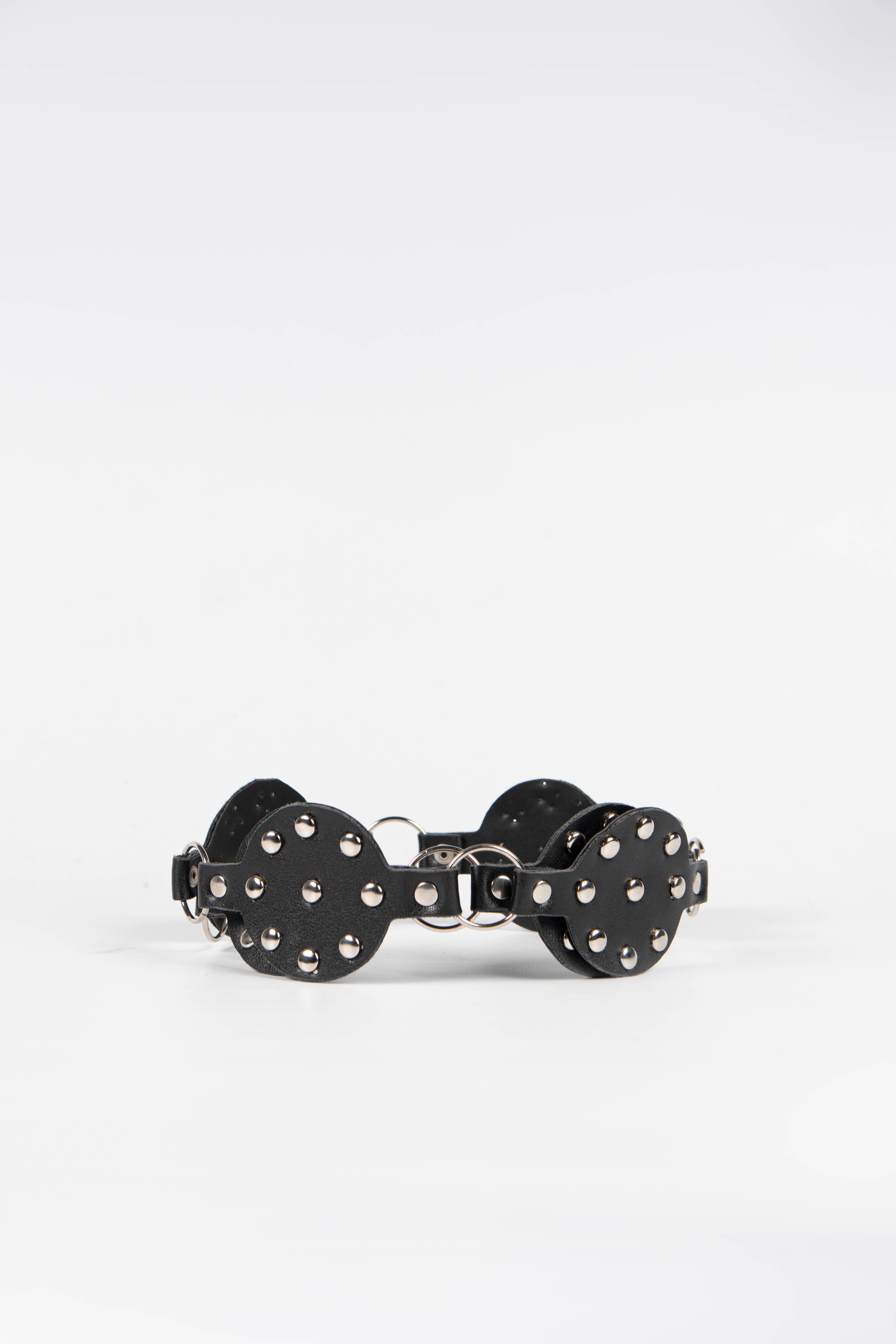 Contiene cinco cintos faja con tachas de un mismo modelo en color negro.