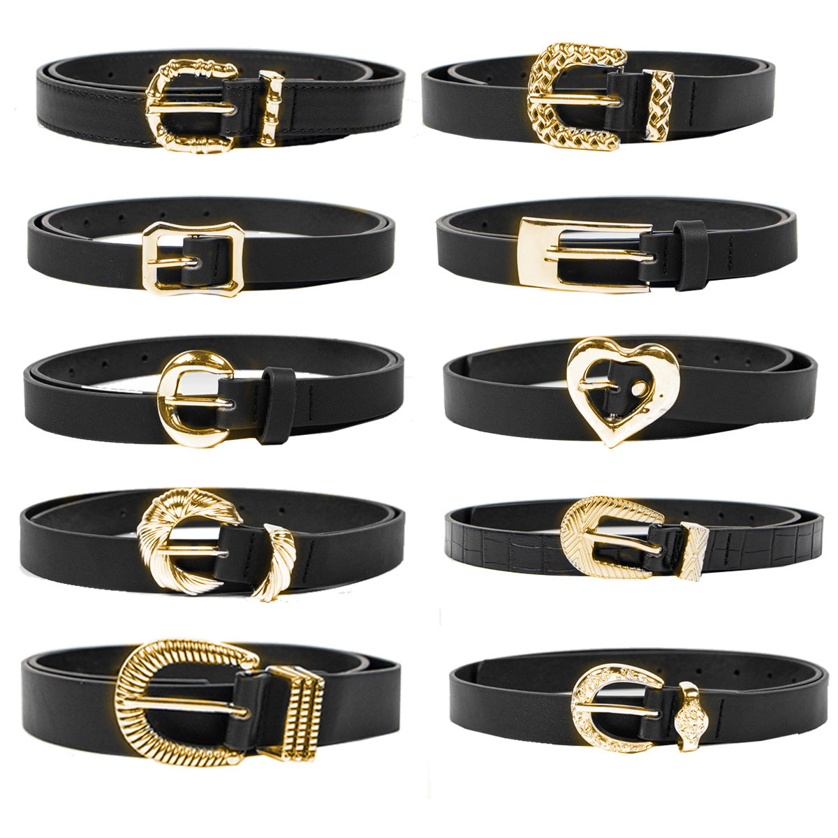 Contiene diez cintos importados con hebilla dorada de diferentes modelos.