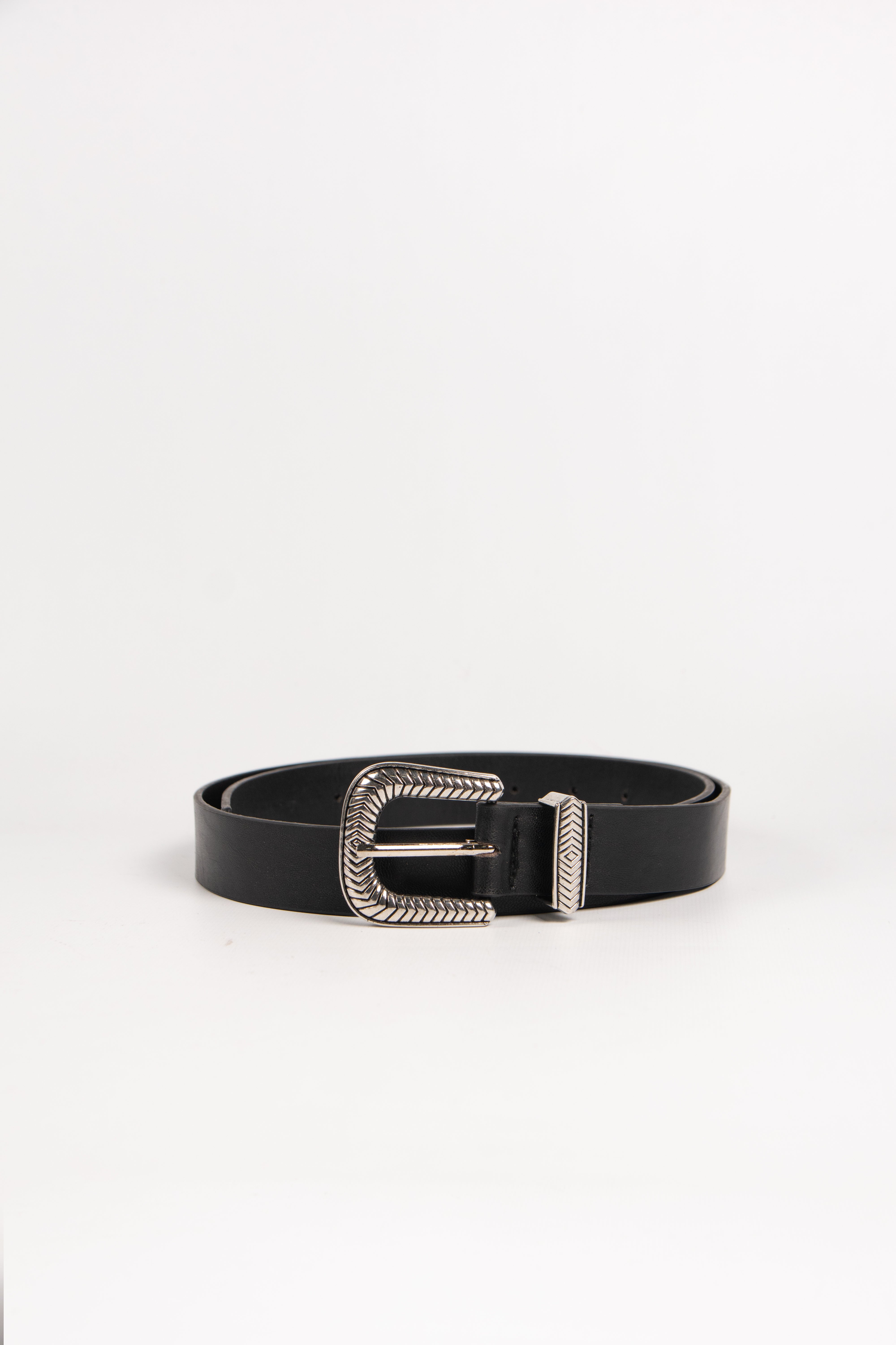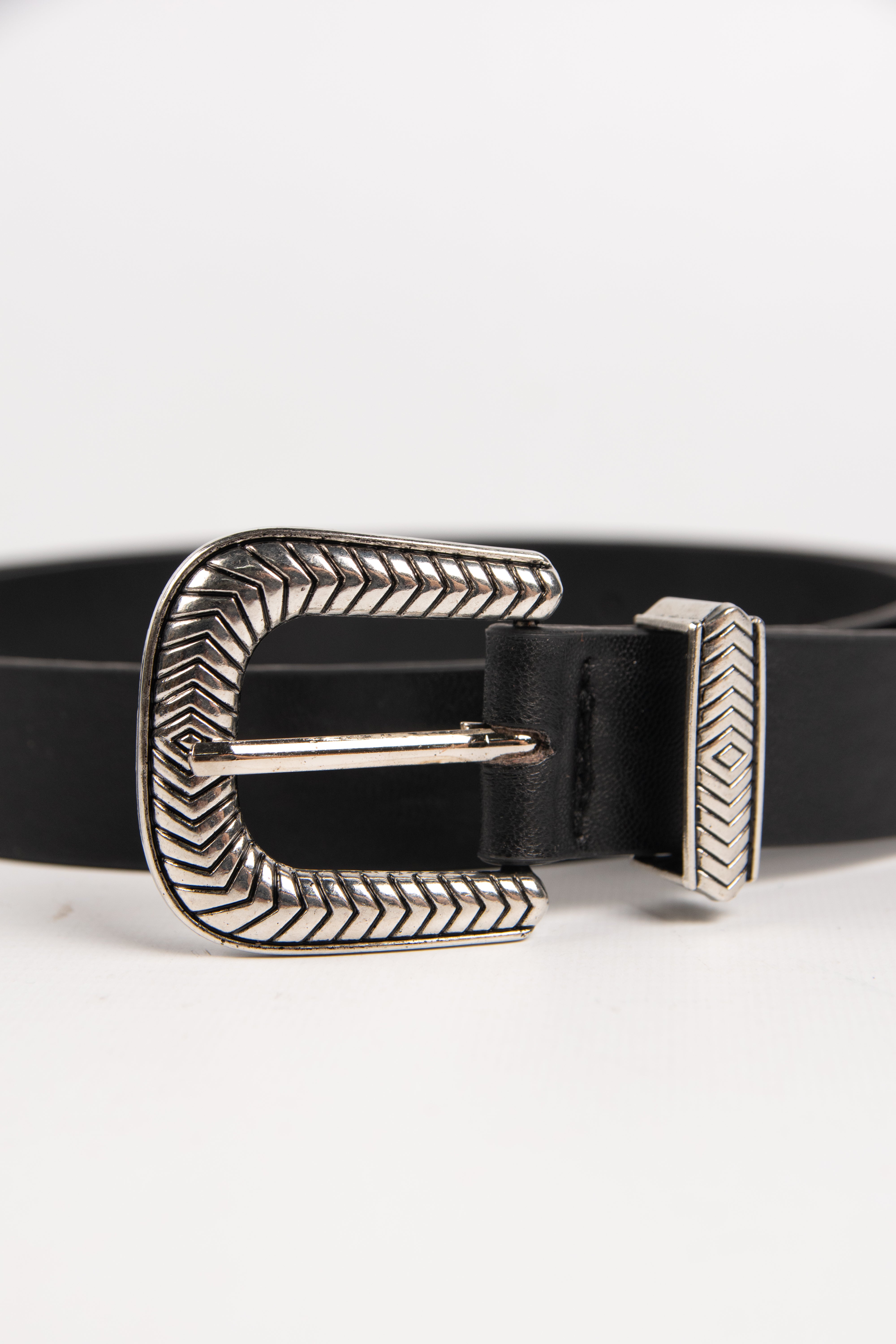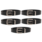 Contiene cinco cintos lisos importado de un mismo modelo en color negro con hebilla plateada.