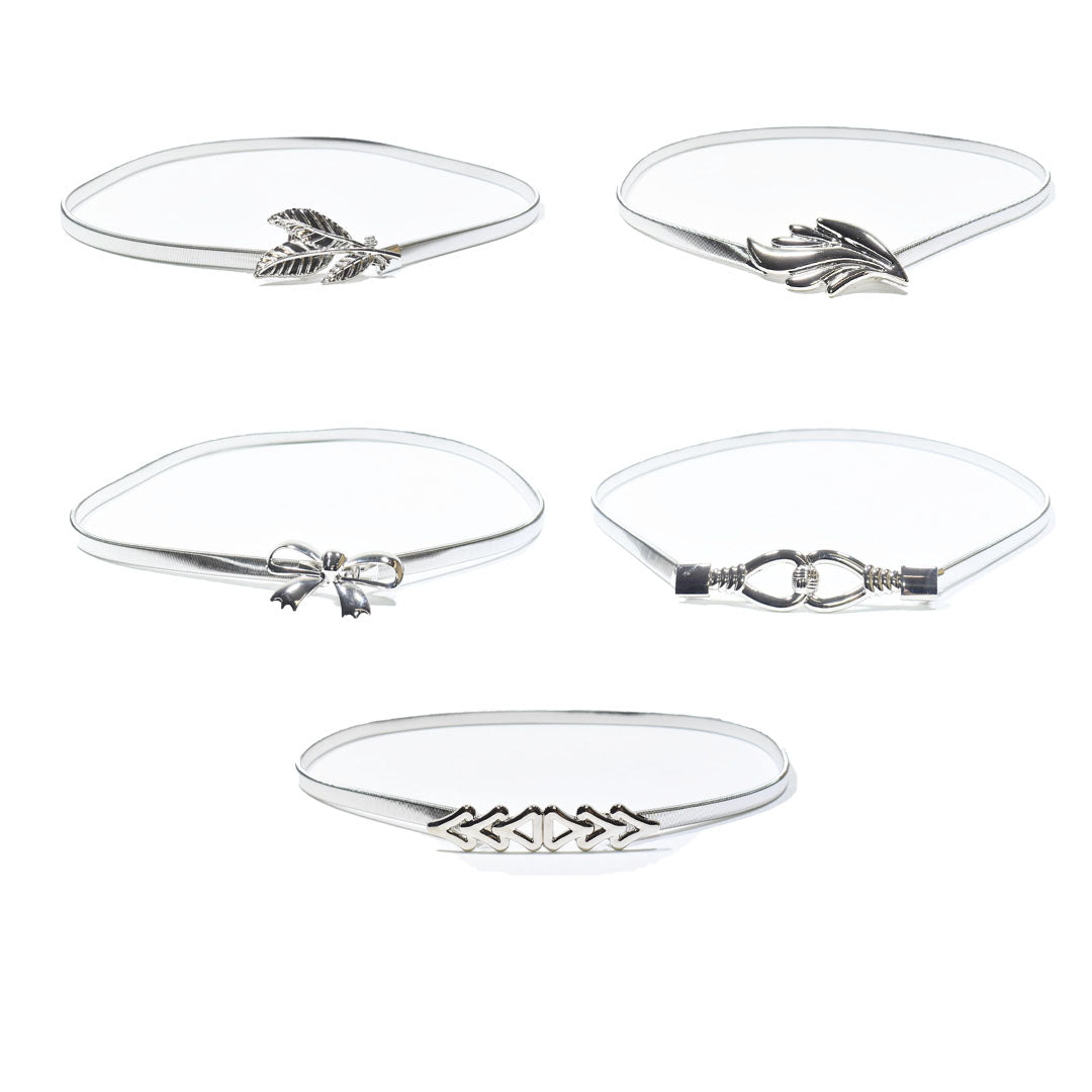 Contiene cinco cintos elastizados plateados con diferentes hebillas.