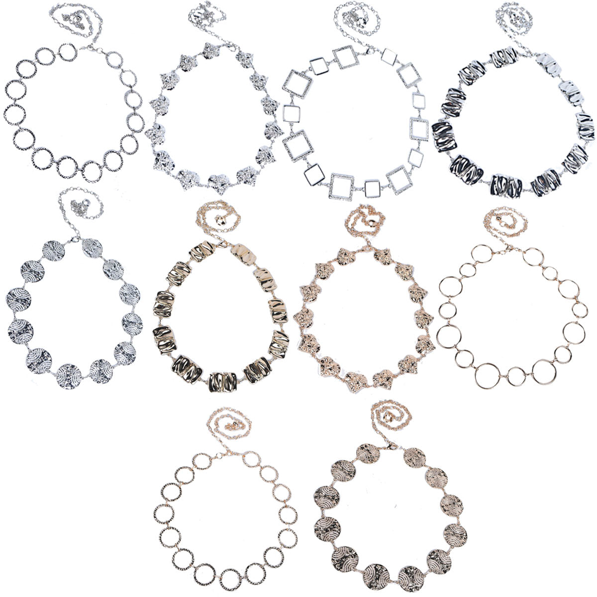 Contiene 10 cintos cadena surtidos, 5 modelos dorados y 5 modelos plateados. En caso de que algún modelo no esté en stock, se cambia por uno similar.