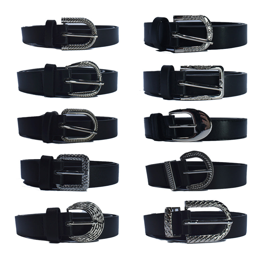 Contiene diez cintos importados con hebilla plateada de diferentes modelos.