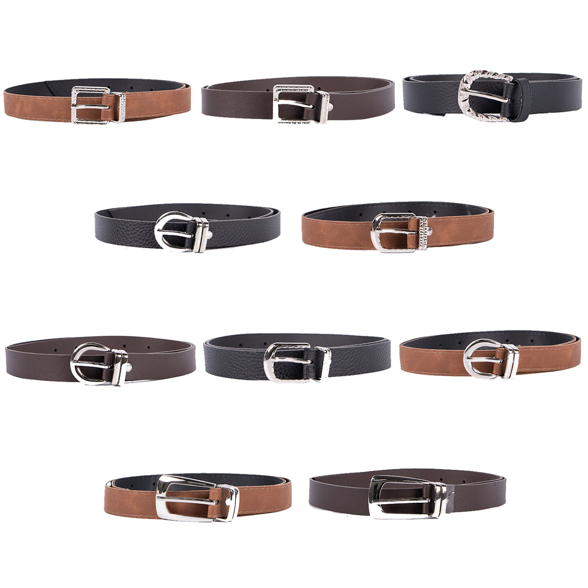 Contiene diez cintos nacionales con hebilla plateada de diferentes modelos.