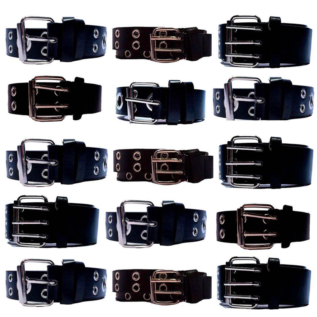 Contiene quince cintos negros con tachas en plateado de diferentes modelos.