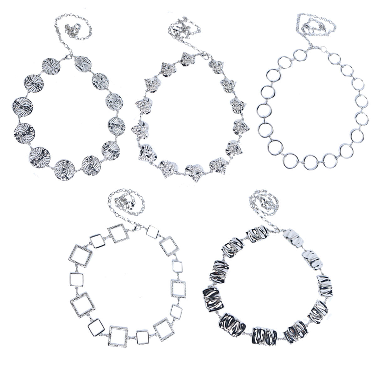 Contiene 5 cintos cadena plateados en modelos surtidos.