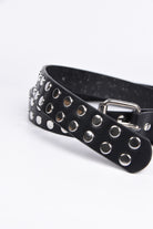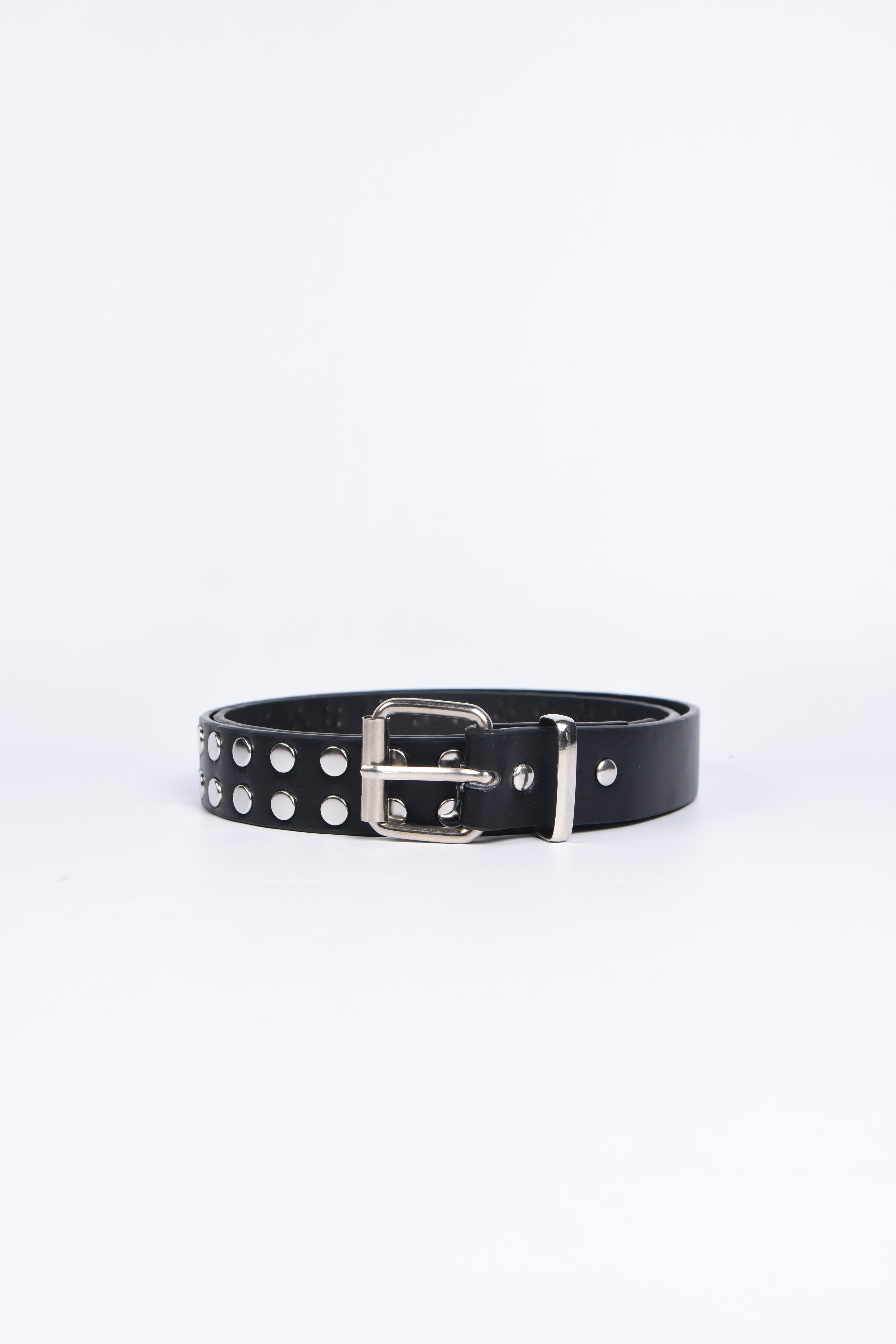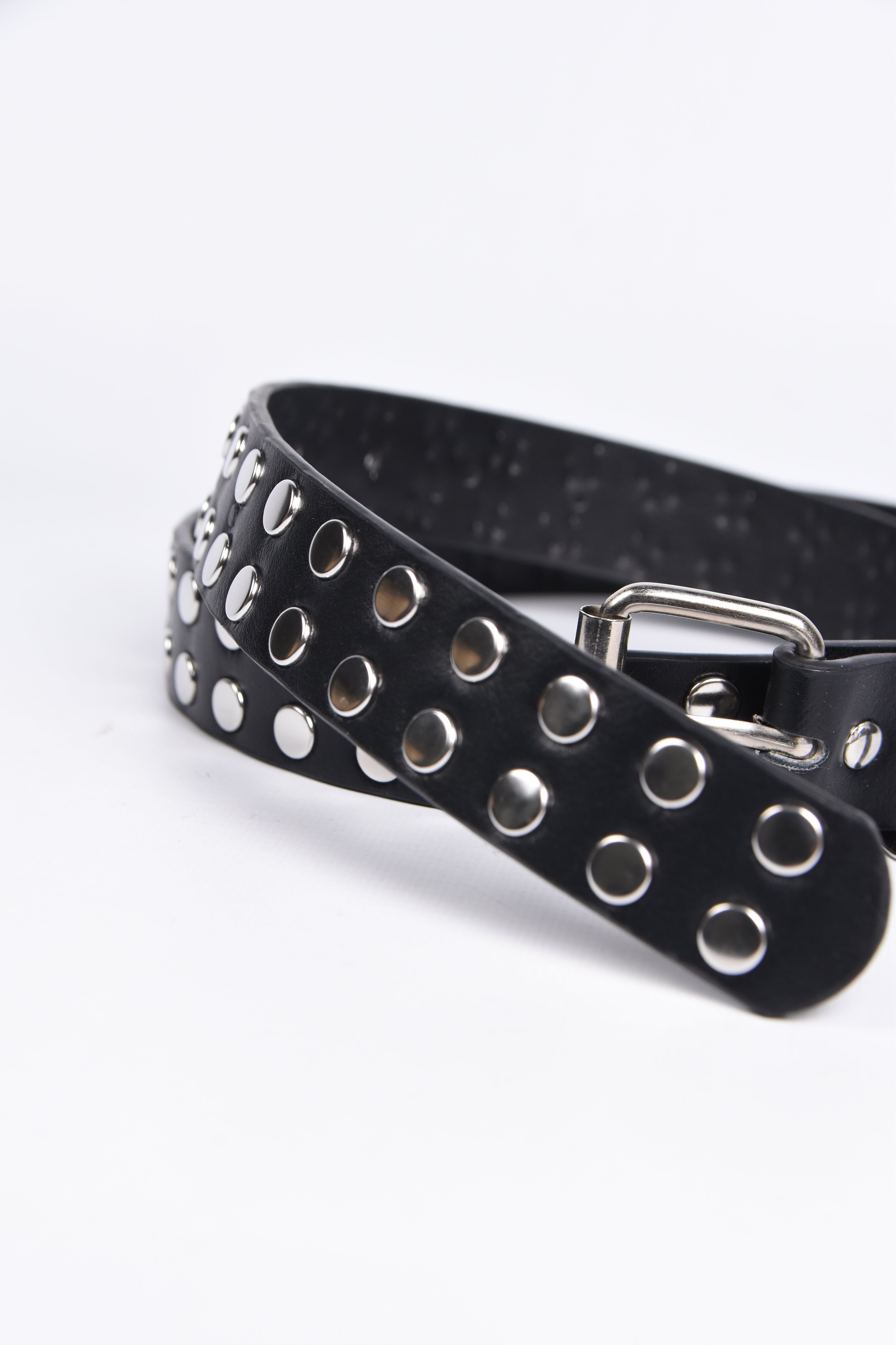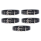 Contiene 5 cintos con tacha de un mismo modelo en negro con hebilla plateada.