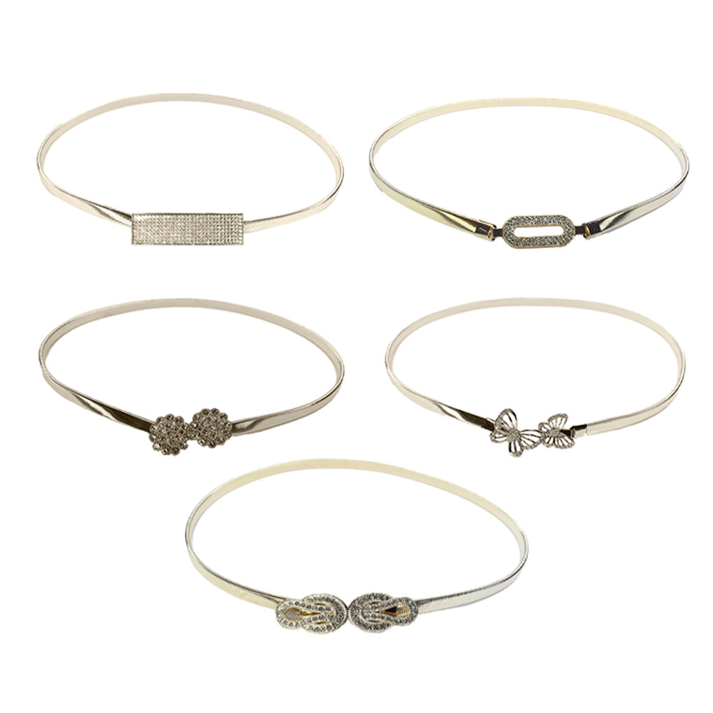 Contiene cinco cintos elastizados dorados con hebillas de strass de diferentes modelos.