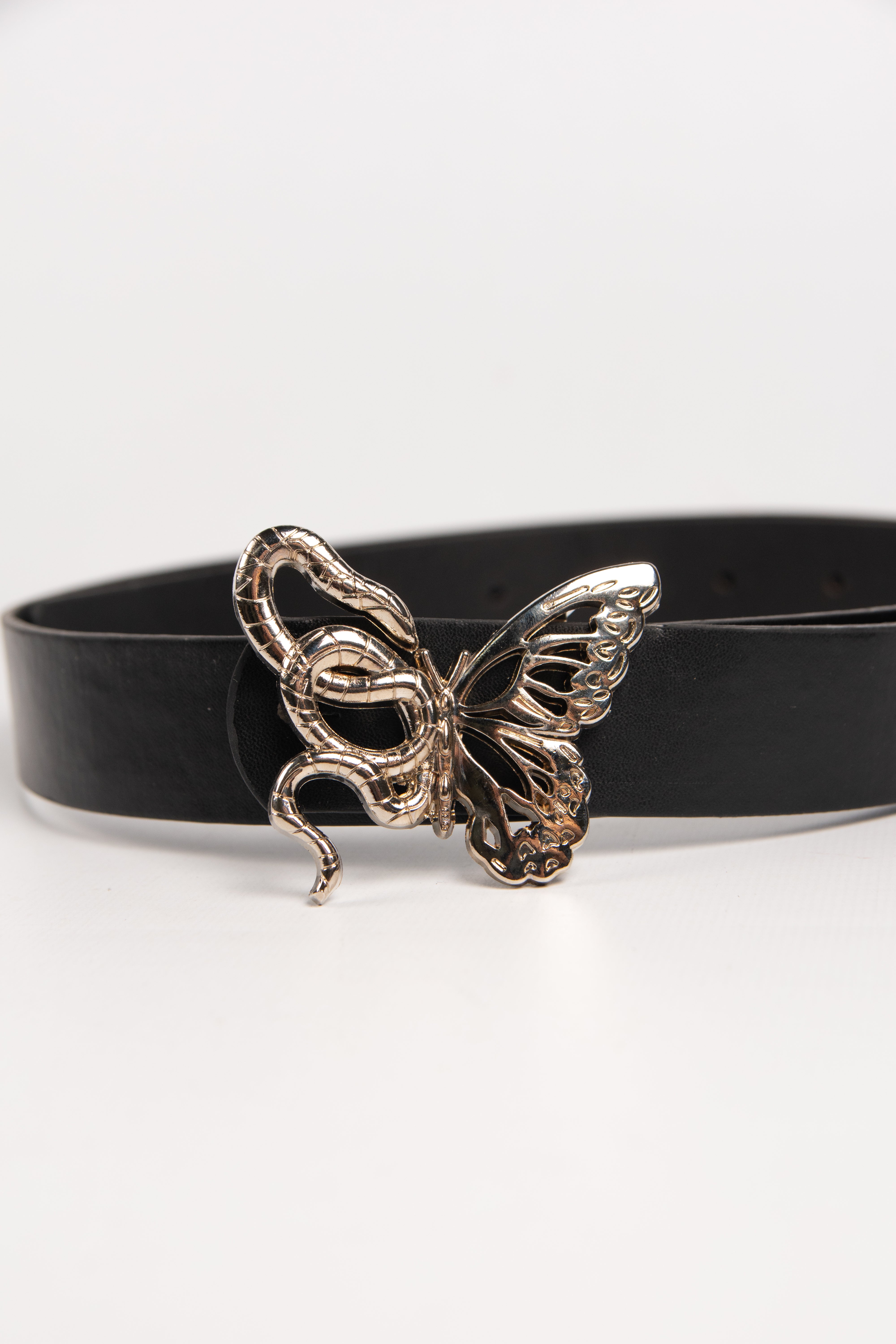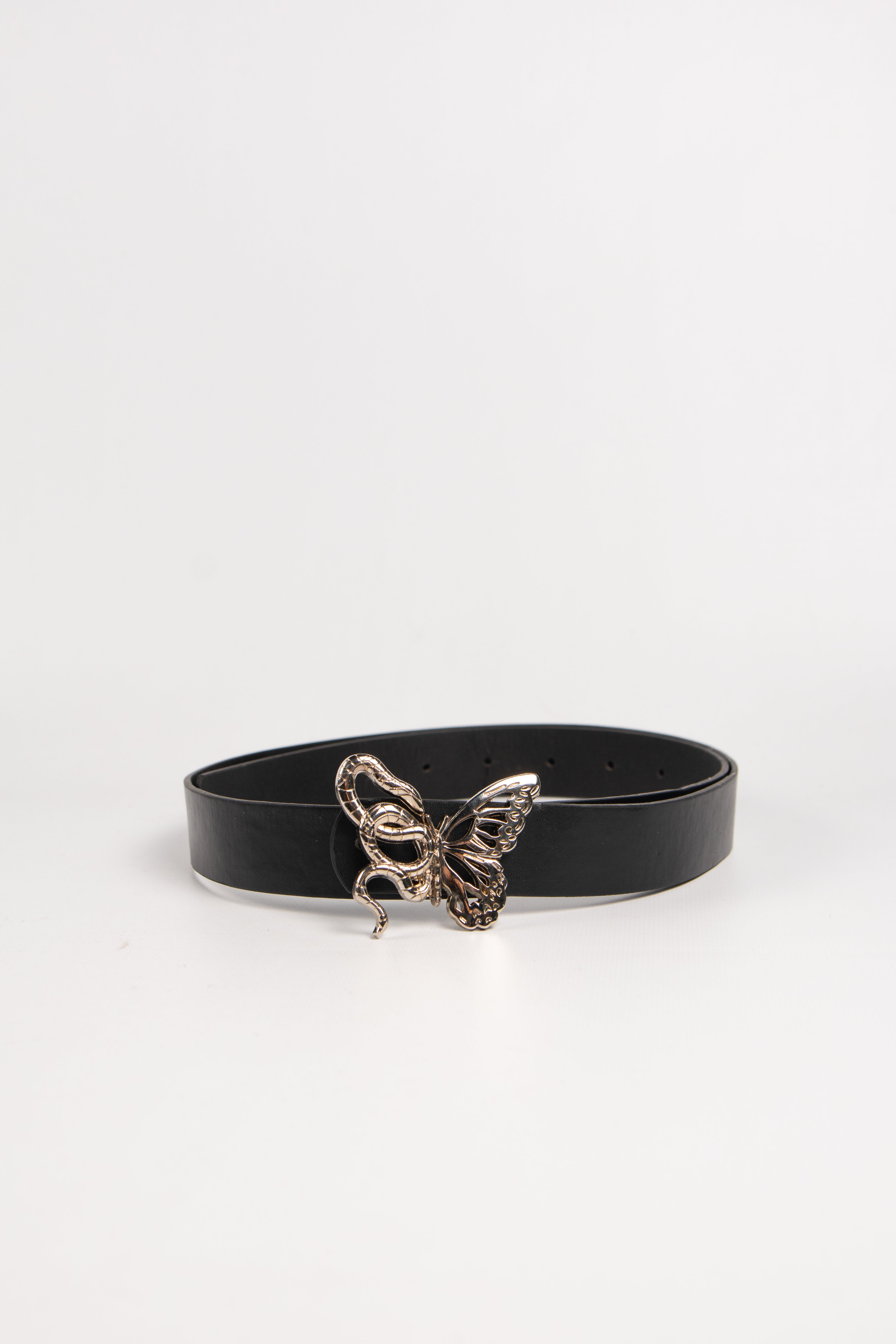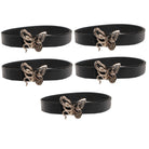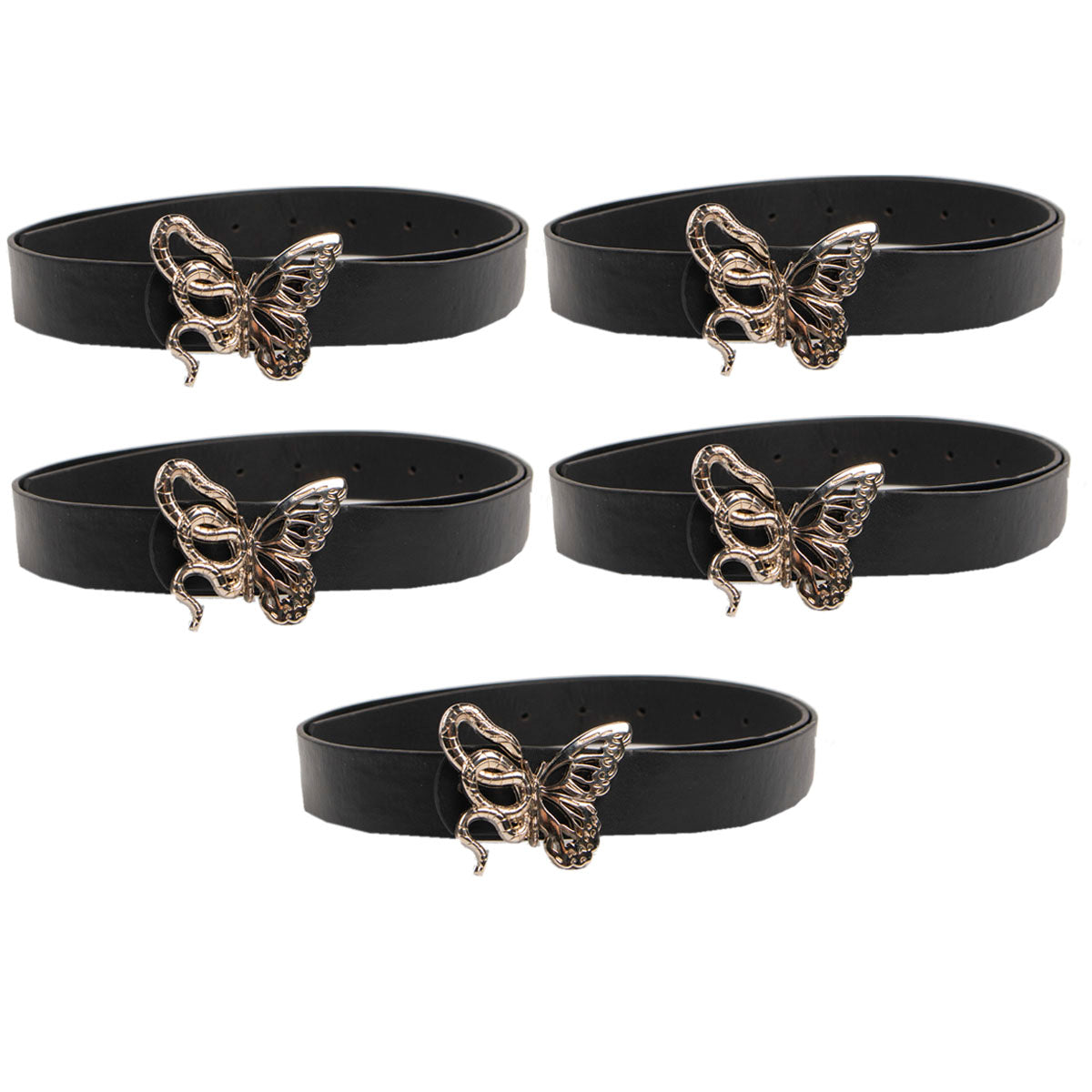 Contiene cinco cintos de un mismo modelo en negro con hebilla plateada.