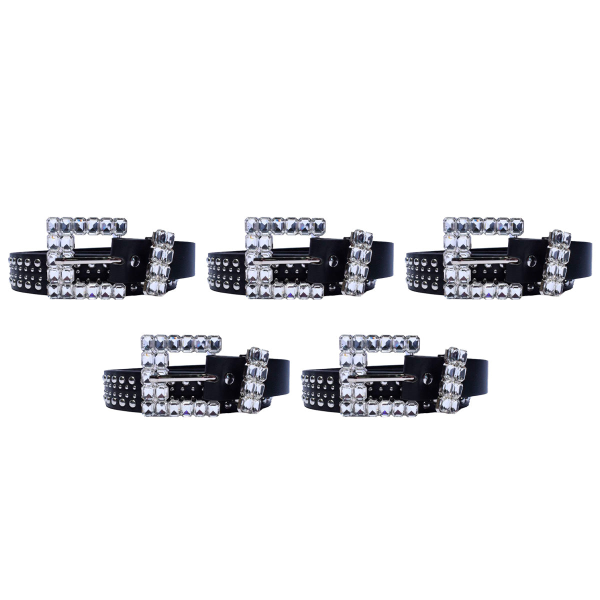 Contiene cinco cintos negros con tachas y strass de un mismo modelo