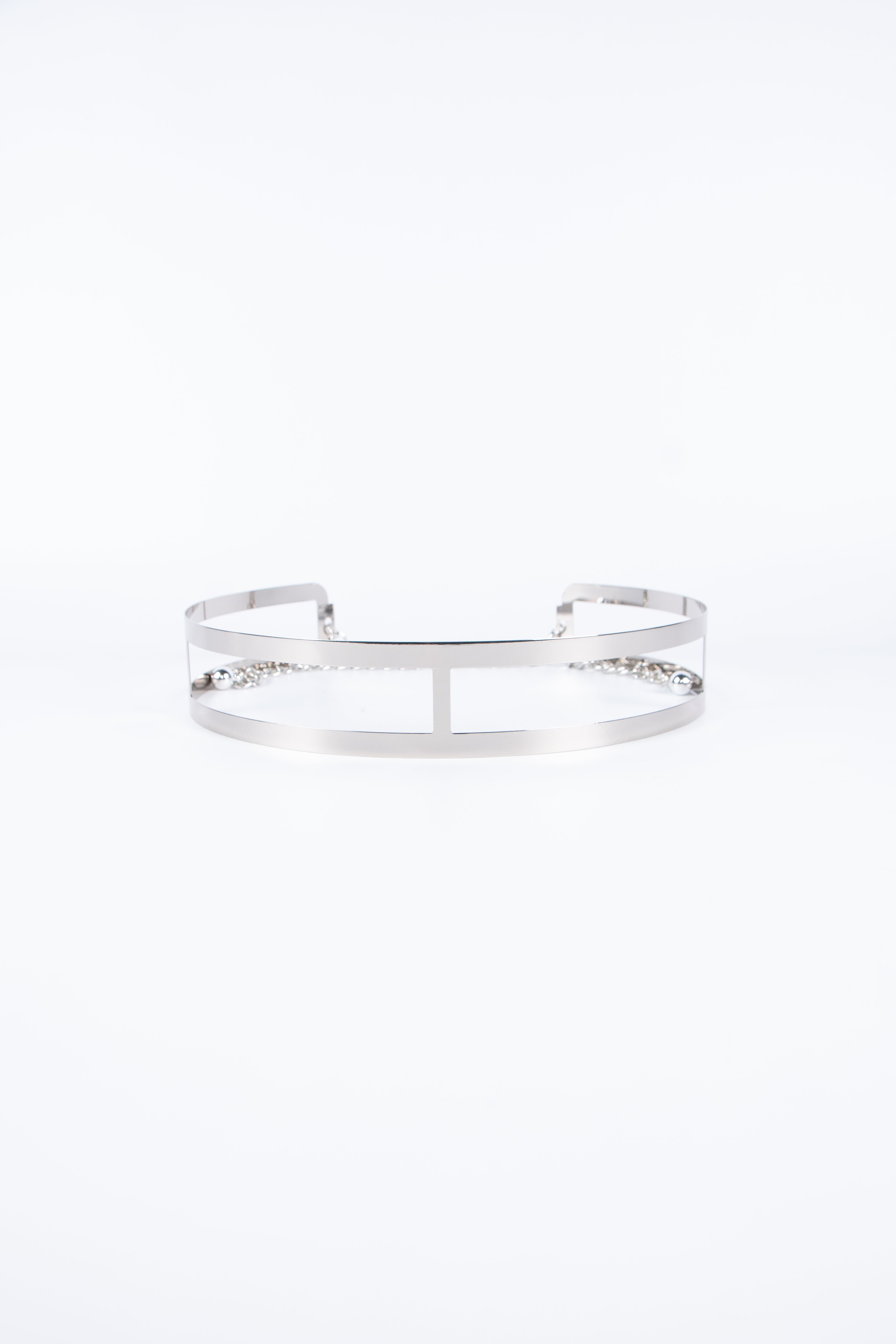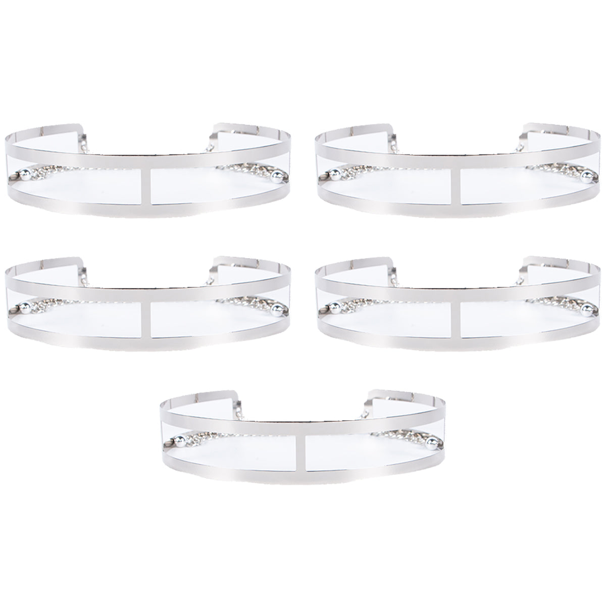 Contiene cinco cintos rígidos de un mismo modelo en plateado.