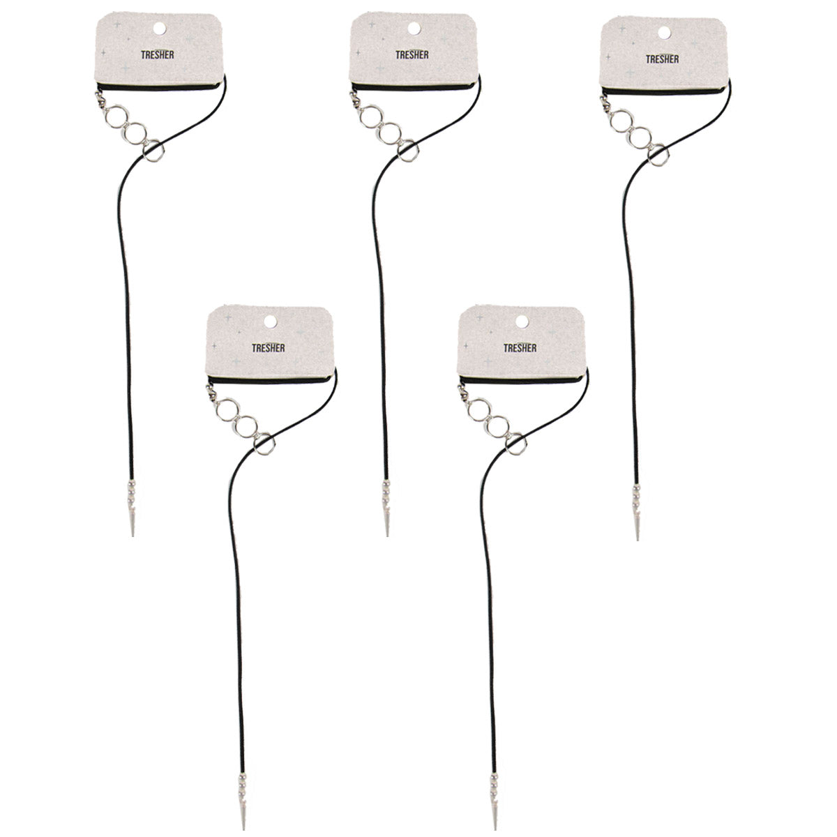 contiene cinco corbatines de un mismo modelo en color negro con dije plateado.