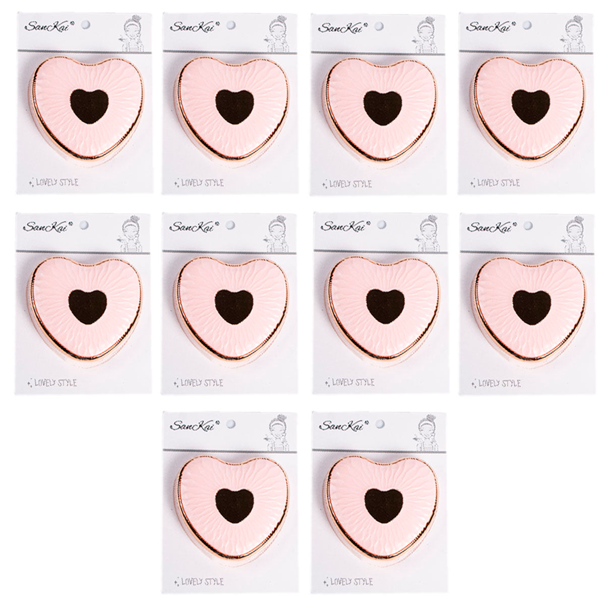 Contiene 10 espejos de un mismo modelo en color rosa.
